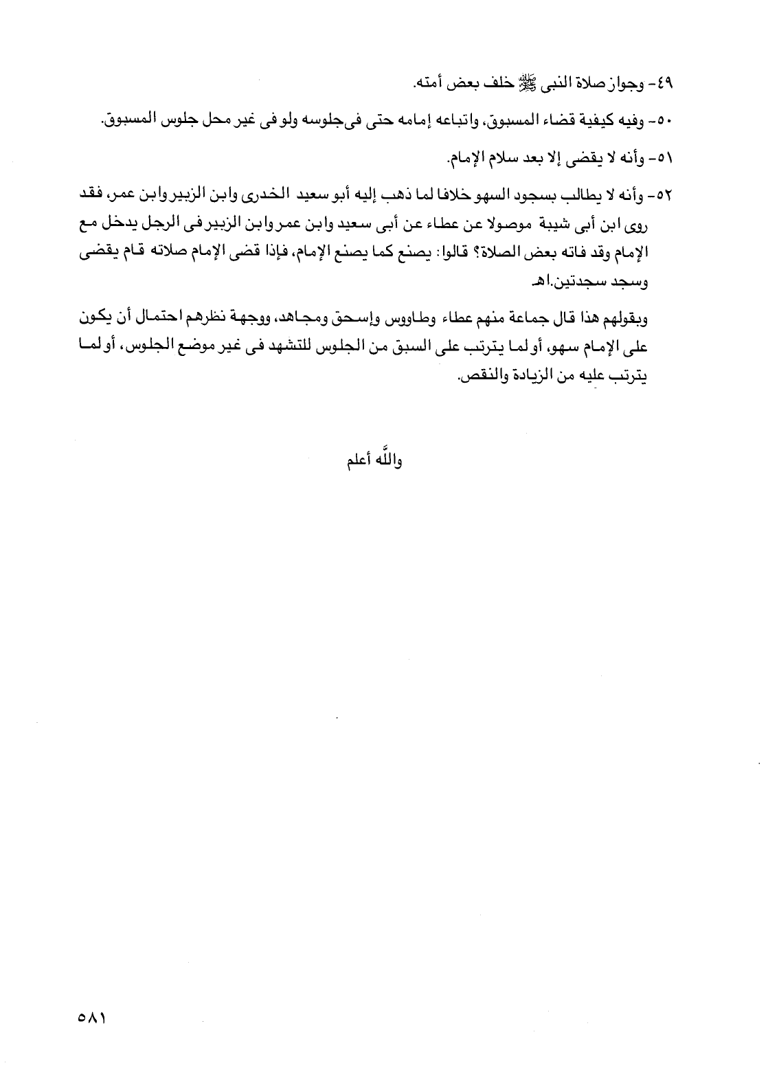 50 - وفيه كيفية قضاء المسبوق، واتباعه إمامه حتى في جلوسه ولو في غير محل جلوس المسبوق.
