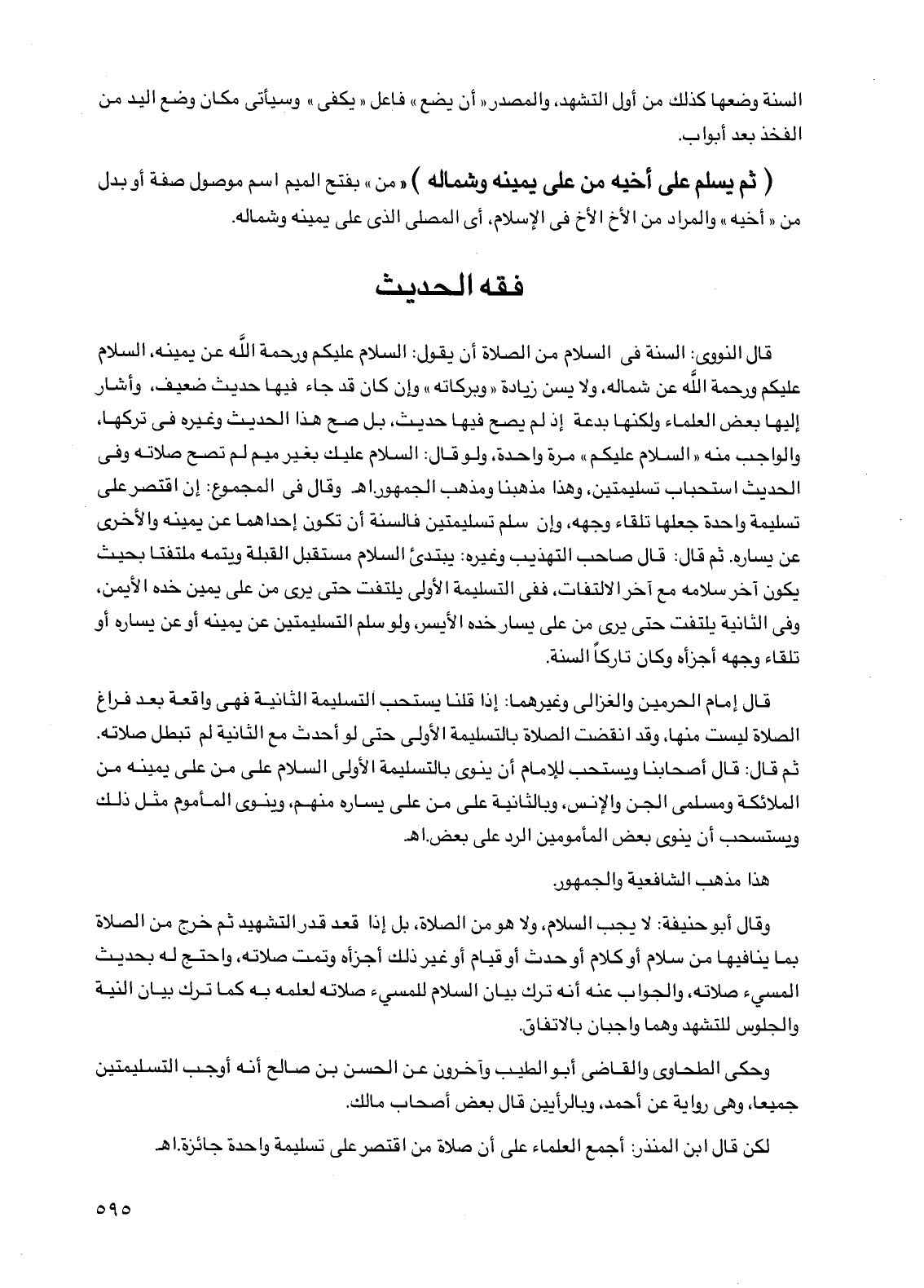 وقال أبو حنيفة: لا يجب السلام، ولا هو من الصلاة، بل إذا قعد قدر التشهيد ثم خرج من الصلاة بما ينافيها من سلام أو كلام أو حدث أو قيام أو غير ذلك أجزأه وتمت صلاته، واحتج له بحديث المسيء صلاته، والجواب عنه أنه ترك بيان السلام للمسيء صلاته لعلمه به كما ترك بيان النية والجلوس للتشهد وهما واجبان بالاتفاق.