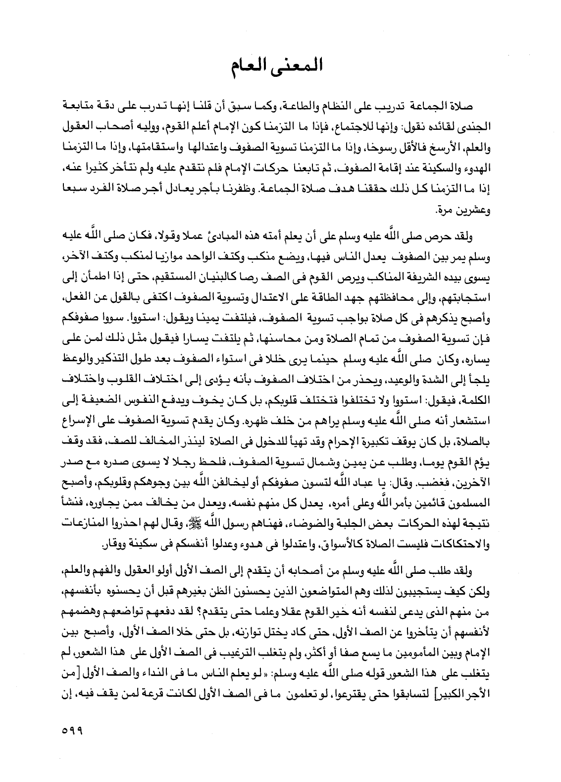 ولقد حرص صلى الله عليه وسلم على أن يعلم أمته هذه المبادئ عملا وقولا، فكان صلى الله عليه وسلم يمر بين الصفوف يعدل الناس فيها، ويضع منكب وكتف الواحد موازيا لمنكب وكتف الآخر، يسوي بيده الشريفة المناكب ويرص القوم في الصف رصا كالبنيان المستقيم، حتى إذا اطمأن إلى استجابتهم، وإلى محافظتهم جهد الطاقة على الاعتدال وتسوية الصفوف اكتفى بالقول عن الفعل، وأصبح يذكرهم في كل صلاة بواجب تسوية الصفوف، فيلتفت يمينا ويقول: استووا. سووا صفوفكم فإن تسوية الصفوف من تمام الصلاة ومن محاسنها، ثم يلتفت يسارا فيقول مثل ذلك لمن على يساره، وكان صلى الله عليه وسلم حينما يرى خللا في استواء الصفوف بعد طول التذكير والوعظ يلجأ إلى الشدة والوعيد، ويحذر من اختلاف الصفوف بأنه يؤدي إلى اختلاف القلوب واختلاف الكلمة، فيقول: استووا ولا تختلفوا فتختلف قلوبكم، بل كان يخوف ويدفع النفوس الضعيفة إلى استشعار أنه صلى الله عليه وسلم يراهم من خلف ظهره. وكان يقدم تسوية الصفوف على الإسراع بالصلاة، بل كان يوقف تكبيرة الإحرام وقد تهيأ للدخول في الصلاة لينذر المخالف للصف، فقد وقف يؤم القوم يوما، وطلب عن يمين وشمال تسوية الصفوف، فلحظ رجلا لا يسوي صدره مع صدر الآخرين، فغضب. وقال: يا عباد الله لتسون صفوفكم أو ليخالفن الله بين وجوهكم وقلوبكم، وأصبح المسلمون قائمين بأمر الله وعلى أمره، يعدل كل منهم نفسه، ويعدل من يخالف ممن يجاوره، فنشأ نتيجة لهذه الحركات بعض الجلبة والضوضاء، فهناهم رسول الله صلى الله عليه وسلم، وقال لهم احذروا المنازعات والاحتكاكات فليست الصلاة كالأسواق، واعتدلوا في هدوء وعدلوا أنفسكم في سكينة ووقار.