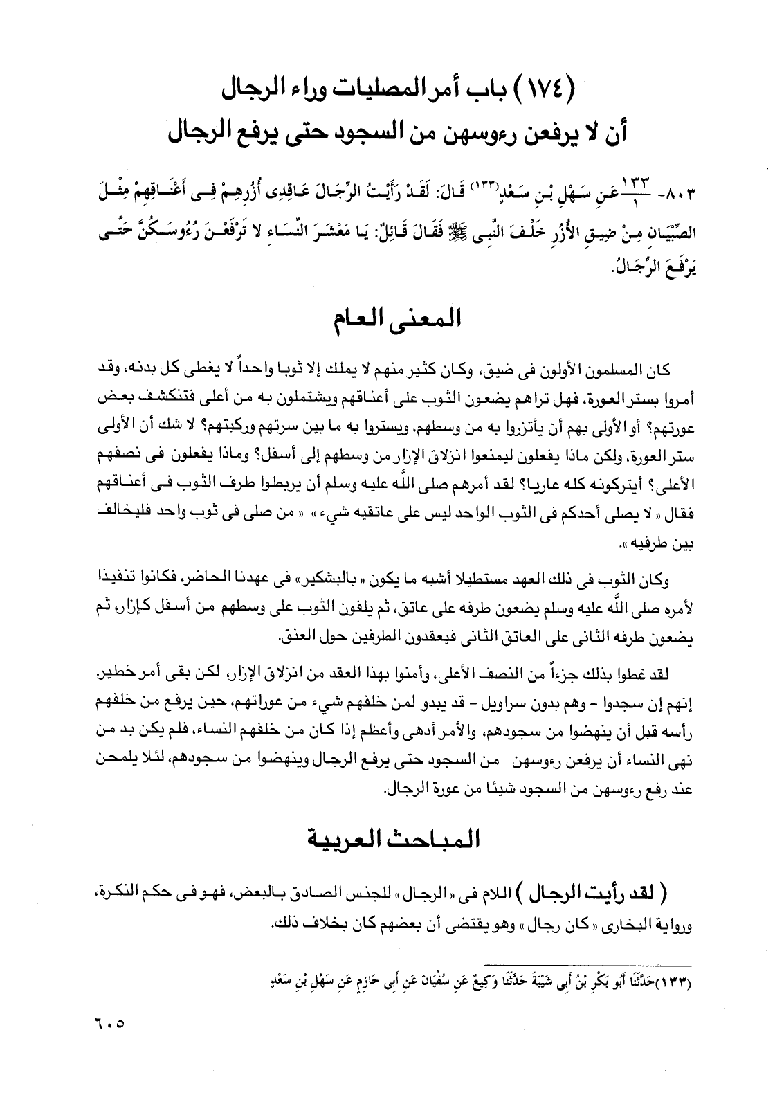 803 - عن سهل بن سعد قال: لقد رأيت الرجال عاقدي أزرهم في أعناقهم مثل الصبيان من ضيق الأزر خلف النبي صلى الله عليه وسلم فقال قائل: يا معشر النساء لا ترفعن رءوسكن حتى يرفع الرجال.