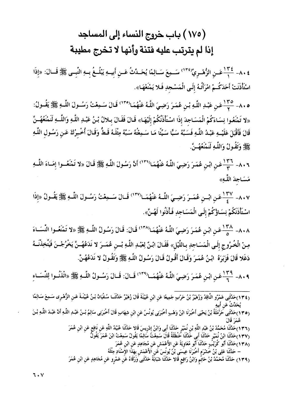 806 - عن ابن عمر رضي الله عنهما أن رسول الله صلى الله عليه وسلم قال "لا تمنعوا إماء الله مساجد الله".