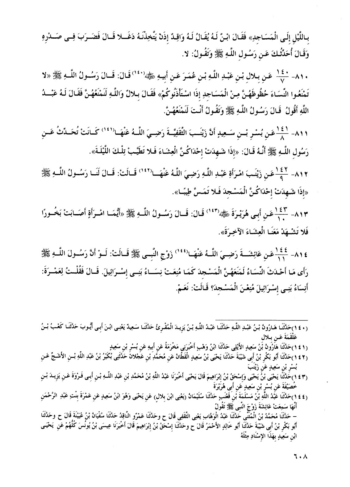 810 - عن بلال بن عبد الله بن عمر عن أبيه رضي الله عنه قال: قال رسول الله صلى الله عليه وسلم "لا تمنعوا النساء حظوظهن من المساجد إذا استأذنوكم" فقال بلال والله لنمنعهن فقال له عبد الله أقول قال رسول الله صلى الله عليه وسلم وتقول أنت لنمنعهن.