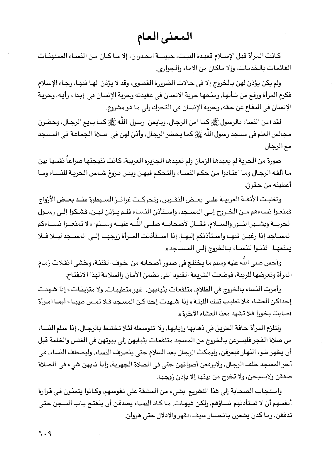 ولم يكن يؤذن لهن بالخروج إلا في حالات الضرورة القصوى، وقد لا يؤذن لها فيها، وجاء الإسلام فكرم المرأة ورفع من شأنها، ومنحها حرية الإنسان في عقيدته وحرية الإنسان في إبداء رأيه، وحرية الإنسان في الدفاع عن حقه، وحرية الإنسان في التحرك إلى ما هو مشروع.