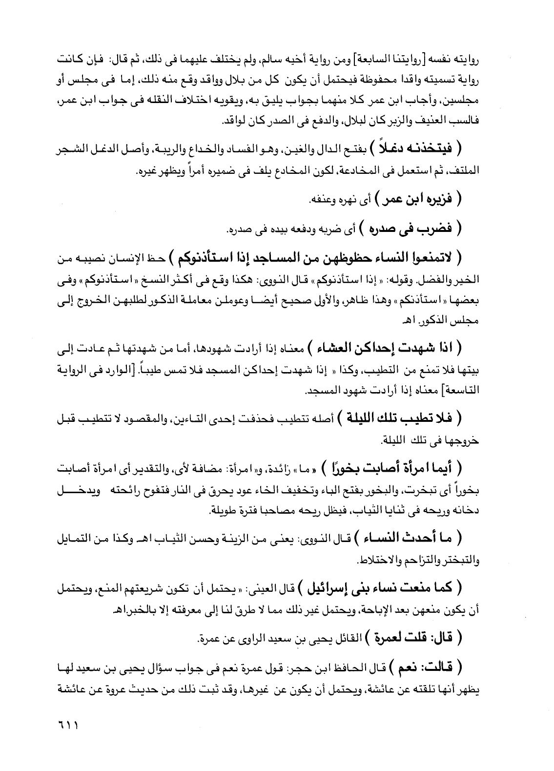(لا تمنعوا النساء حظوظهن من المساجد إذا استأذنوكم) حظ الإنسان نصيبه من الخير والفضل. وقوله: "إذا استأذنوكم" قال النووي: هكذا وقع في أكثر النسخ "استأذنوكم" وفي بعضها "استأذنكم" وهذا ظاهر، والأول صحيح أيضا وعوملن معاملة الذكور لطلبهن الخروج إلى مجلس الذكور. اهـ.