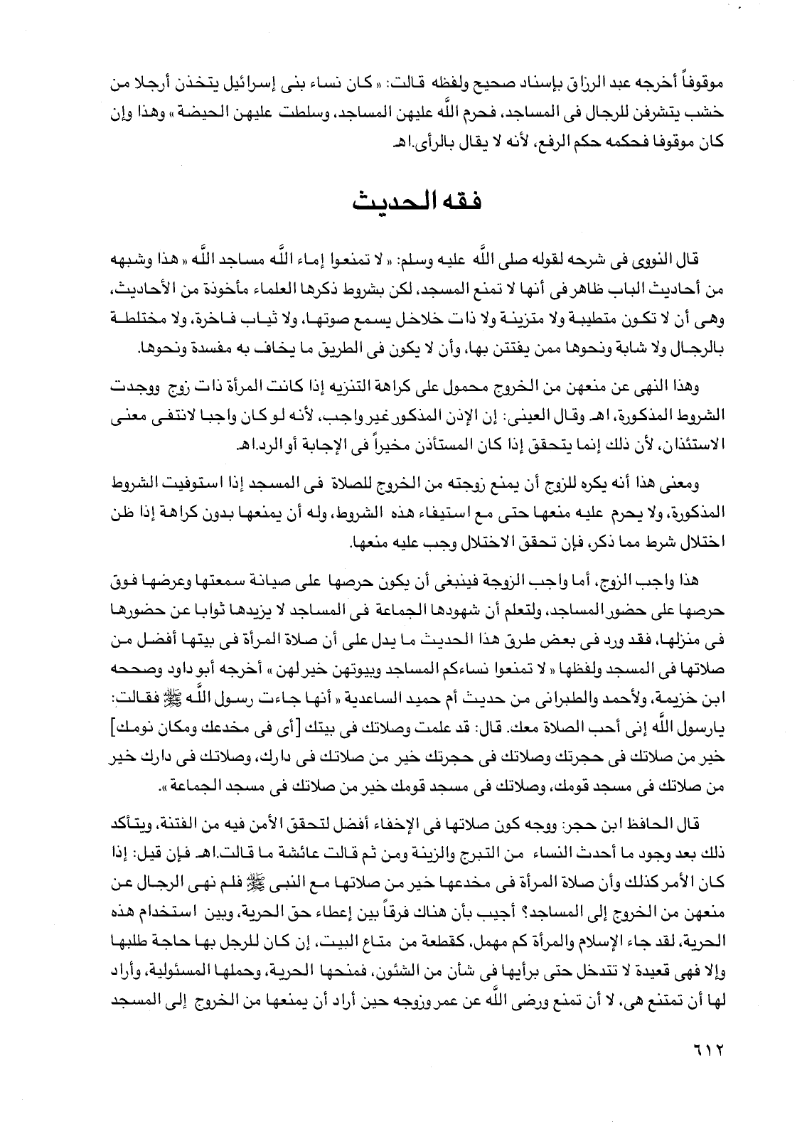 هذا واجب الزوج، أما واجب الزوجة فينبغي أن يكون حرصها على صيانة سمعتها وعرضها فوق حرصها على حضور المساجد، ولتعلم أن شهودها الجماعة في المساجد لا يزيدها ثوابا عن حضورها في منزلها، فقد ورد في بعض طرق هذا الحديث ما يدل على أن صلاة المرأة في بيتها أفضل من صلاتها في المسجد ولفظها "لا تمنعوا نساءكم المساجد وبيوتهن خير لهن" أخرجه أبو داود وصححه ابن خزيمة، ولأحمد والطبراني من حديث أم حميد الساعدية "أنها جاءت رسول الله صلى الله عليه وسلم فقالت: يا رسول الله إني أحب الصلاة معك. قال: قد علمت وصلاتك في بيتك [أي في مخدعك ومكان نومك] خير من صلاتك في حجرتك وصلاتك في حجرتك خير من صلاتك في دارك، وصلاتك في دارك خير من صلاتك في مسجد قومك، وصلاتك في مسجد قومك خير من صلاتك في مسجد الجماعة".