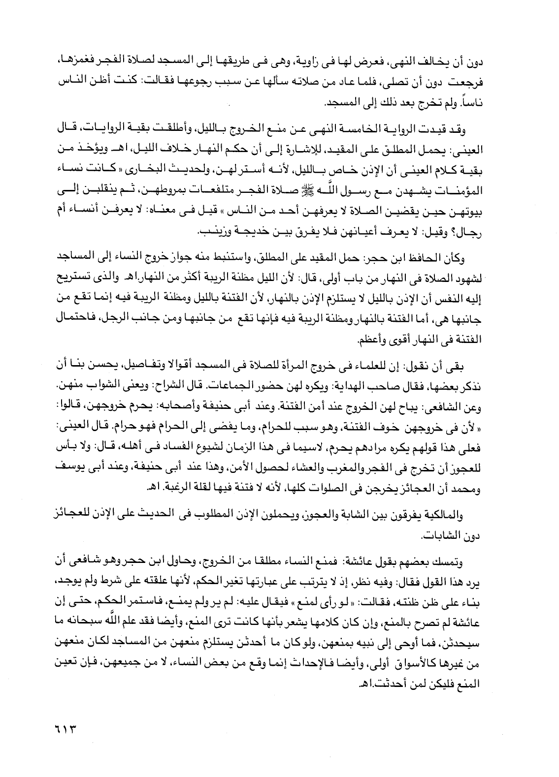 بقي أن نقول: إن للعلماء في خروج المرأة للصلاة في المسجد أقوالا وتفاصيل، يحسن بنا أن نذكر بعضها، فقال صاحب الهداية: ويكره لهن حضور الجماعات. قال الشراح: ويعني الشواب منهن. وعن الشافعي: يباح لهن الخروج عند أمن الفتنة. وعند أبي حنيفة وأصحابه: يحرم خروجهن، قالوا: "لأن في خروجهن خوف الفتنة، وهو سبب للحرام، وما يفضي إلى الحرام فهو حرام. قال العيني: فعلى هذا قولهم يكره مرادهم يحرم، لا سيما في هذا الزمان لشيوع الفساد في أهله، قال: ولا بأس للعجوز أن تخرج في الفجر والمغرب والعشاء لحصول الأمن، وهذا عند أبي حنيفة، وعند أبي يوسف ومحمد أن العجائز يخرجن في الصلوات كلها، لأنه لا فتنة فيها لقلة الرغبة. اهـ.