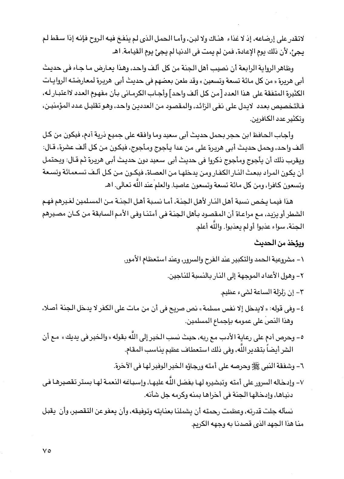 وظاهر الرواية الرابعة أن نصيب أهل الجنة من كل ألف واحد، وهذا يعارض ما جاء في حديث أبي هريرة "من كل مائة تسعة وتسعين" وقد طعن بعضهم في حديث أبي هريرة لمعارضته الروايات الكثيرة المتفقة على هذا العدد [من كل ألف واحد] وأجاب الكرماني بأن مفهوم العدد لا اعتبار له، فالتخصيص بعدد لا يدل على نفي الزائد، والمقصود من العددين واحد، وهو تقليل عدد المؤمنين، وتكثير عدد الكافرين.
