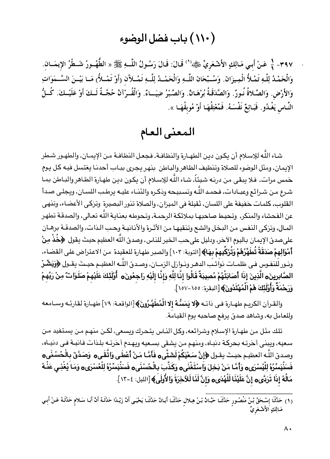 397 - عن أبي مالك الأشعري رضي الله عنه قال: قال رسول الله صلى الله عليه وسلم "الطهور شطر الإيمان. والحمد لله تملأ الميزان. وسبحان الله والحمد لله تملآن (أو تملأ) ما بين السموات والأرض. والصلاة نور. والصدقة برهان. والصبر ضياء. والقرآن حجة لك أو عليك. كل الناس يغدو. فبائع نفسه. فمعتقها أو موبقها".