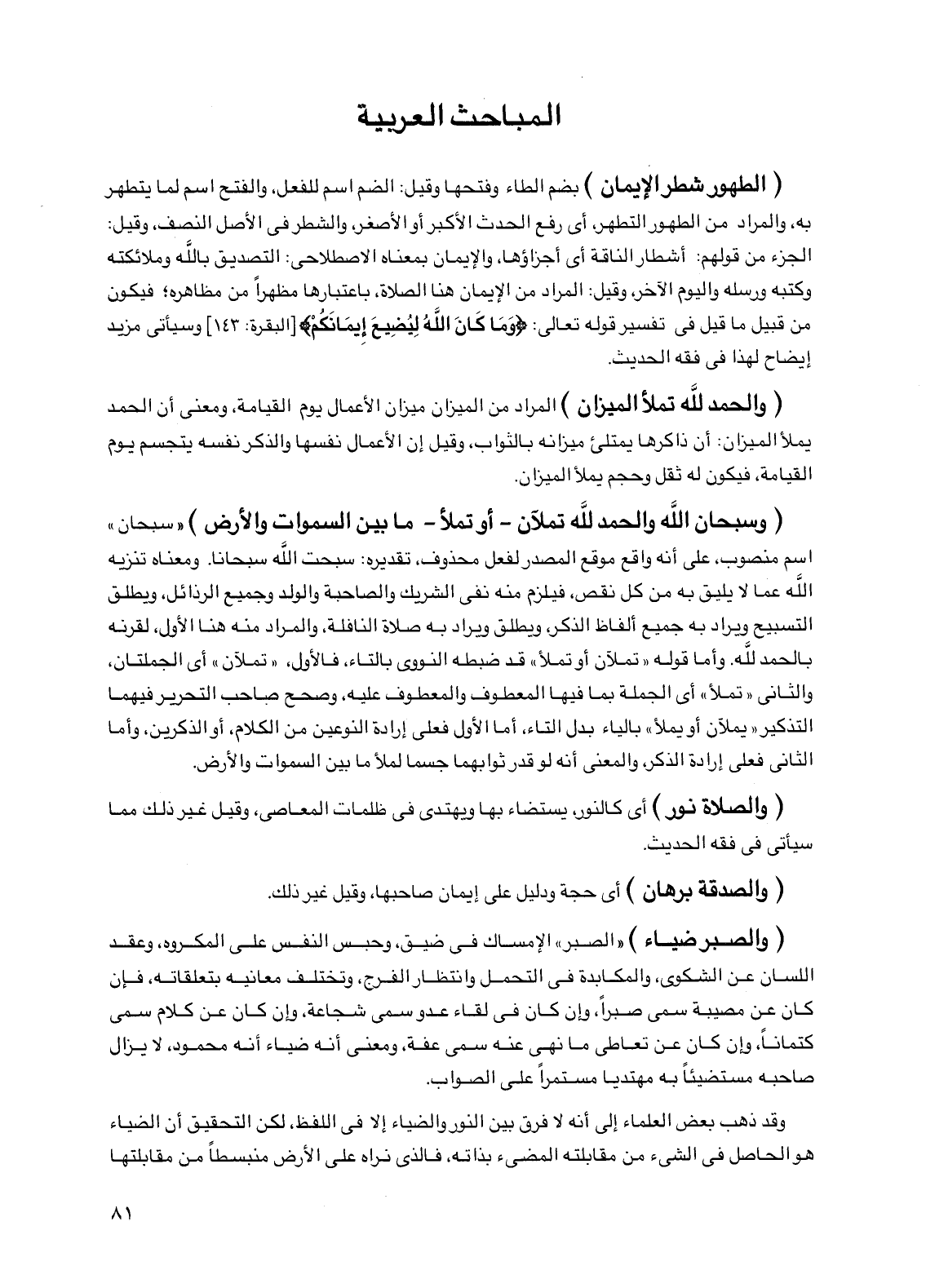 (الطهور شطر الإيمان) بضم الطاء وفتحها وقيل: الضم اسم للفعل، والفتح اسم لما يتطهر به، والمراد من الطهور التطهر، أي رفع الحدث الأكبر أو الأصغر، والشطر في الأصل النصف، وقيل: الجزء من قولهم: أشطار الناقة أي أجزاؤها، والإيمان بمعناه الاصطلاحي: التصديق بالله وملائكته وكتبه ورسله واليوم الآخر، وقيل: المراد من الإيمان هنا الصلاة، باعتبارها مظهرا من مظاهره؛ فيكون من قبيل ما قيل في تفسير قوله تعالى: {وما كان الله ليضيع إيمانكم} [البقرة: 143] وسيأتي مزيد إيضاح لهذا في فقه الحديث.