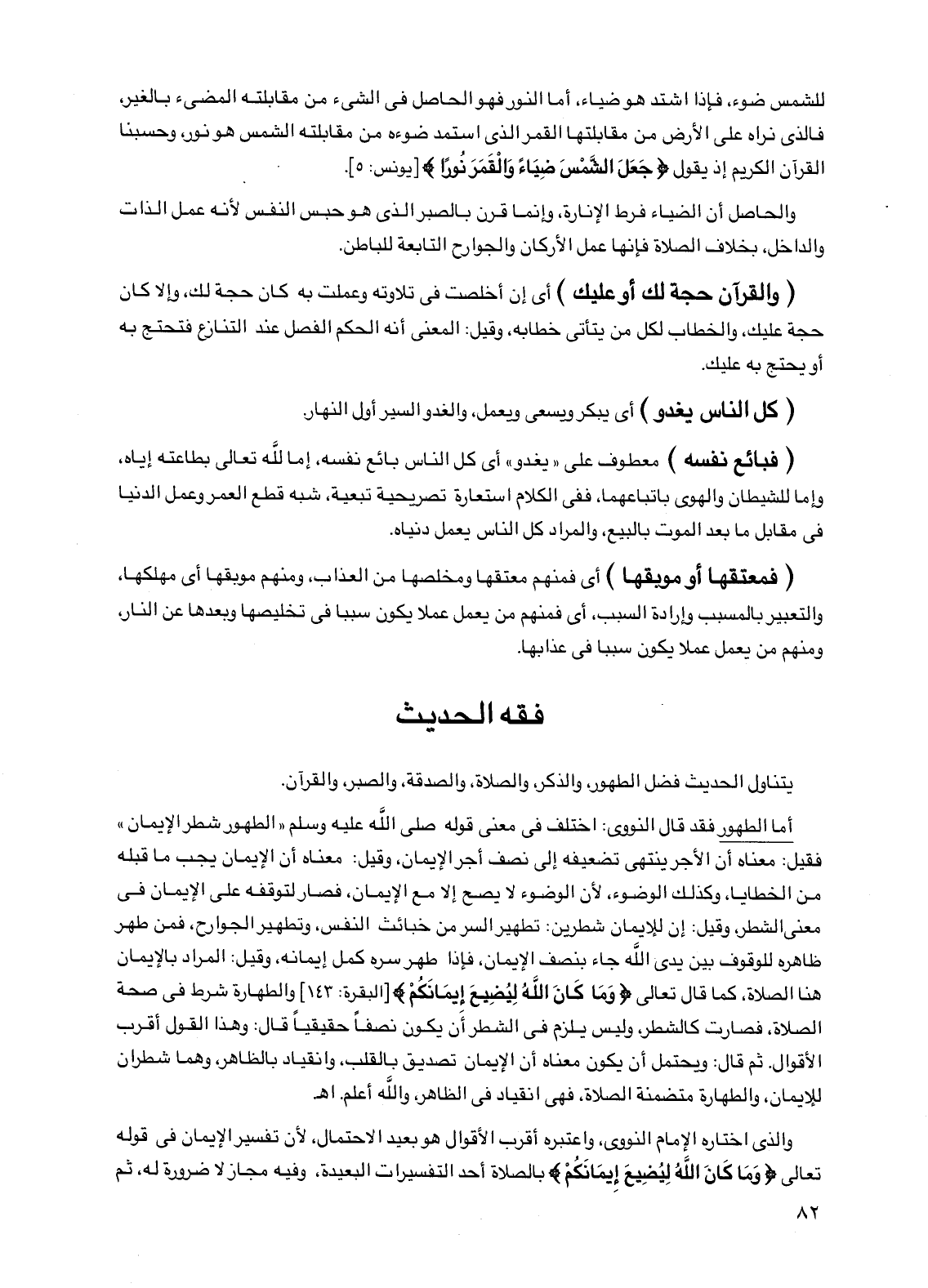 والحاصل أن الضياء فرط الإنارة، وإنما قرن بالصبر الذي هو حبس النفس لأنه عمل الذات والداخل، بخلاف الصلاة فإنها عمل الأركان والجوارح التابعة للباطن.