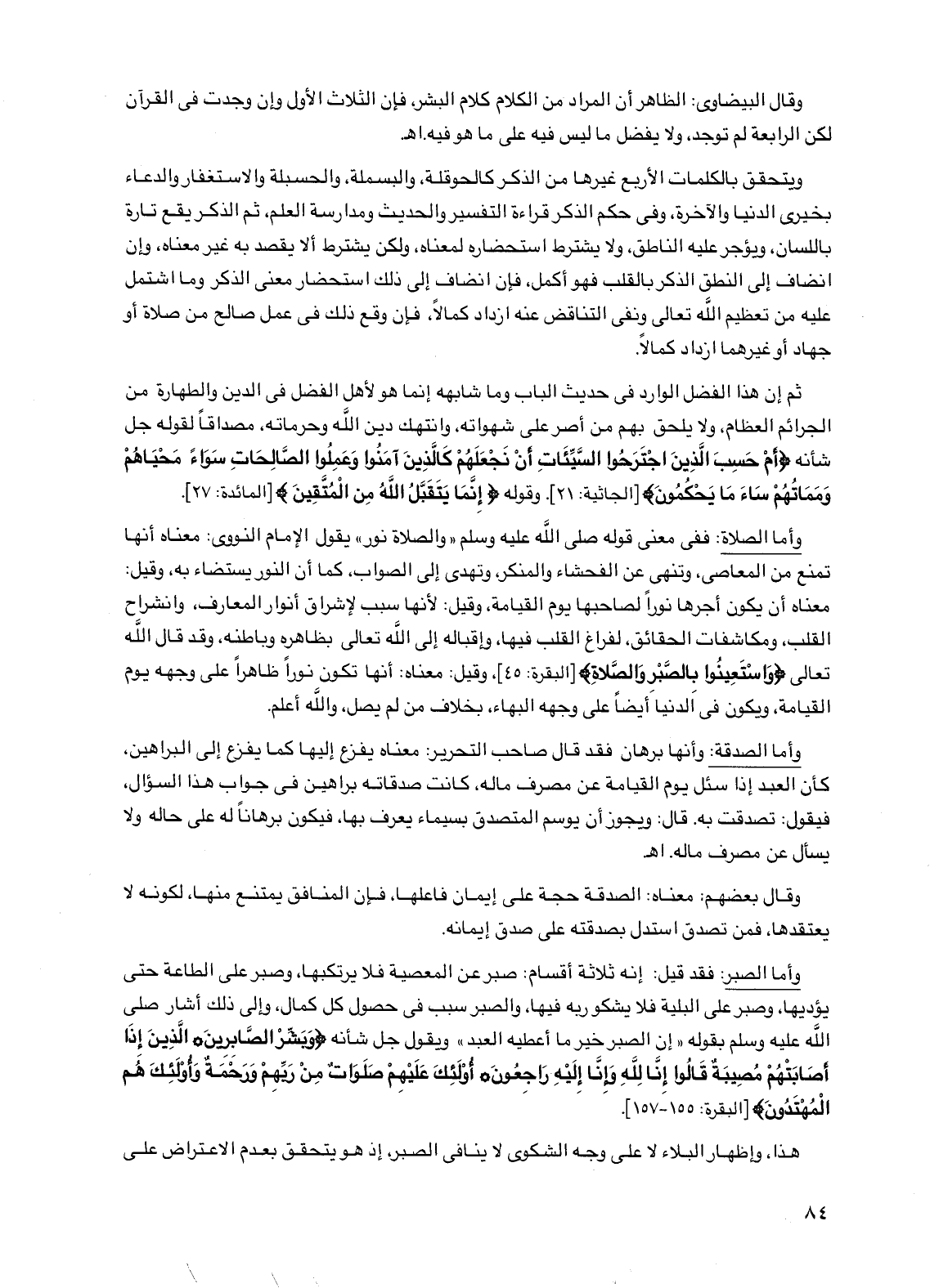 وأما الصبر: فقد قيل: إنه ثلاثة أقسام: صبر عن المعصية فلا يرتكبها، وصبر على الطاعة حتى يؤديها، وصبر على البلية فلا يشكو ربه فيها، والصبر سبب في حصول كل كمال، وإلى ذلك أشار صلى الله عليه وسلم بقوله "إن الصبر خير ما أعطيه العبد" ويقول جل شأنه {وبشر الصابرين* الذين إذا أصابتهم مصيبة قالوا إنا لله وإنا إليه راجعون* أولئك عليهم صلوات من ربهم ورحمة وأولئك هم المهتدون} [البقرة: 155 - 157].