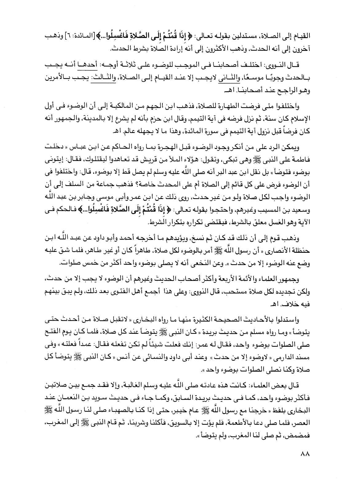 واستدلوا بالأحاديث الصحيحة الكثيرة منها ما رواه البخاري "لا تقبل صلاة من أحدث حتى يتوضأ" وما رواه مسلم من حديث بريدة "كان النبي صلى الله عليه وسلم يتوضأ عند كل صلاة، فلما كان يوم الفتح صلى الصلوات بوضوء واحد، فقال له عمر: إنك فعلت شيئا لم تكن تفعله فقال: عمدا فعلته" وفي مسند الدارمي "لا وضوء إلا من حدث" وعند أبي داود والنسائي عن أنس "كان النبي صلى الله عليه وسلم يتوضأ كل صلاة وكنا نصلي الصلوات بوضوء واحد".