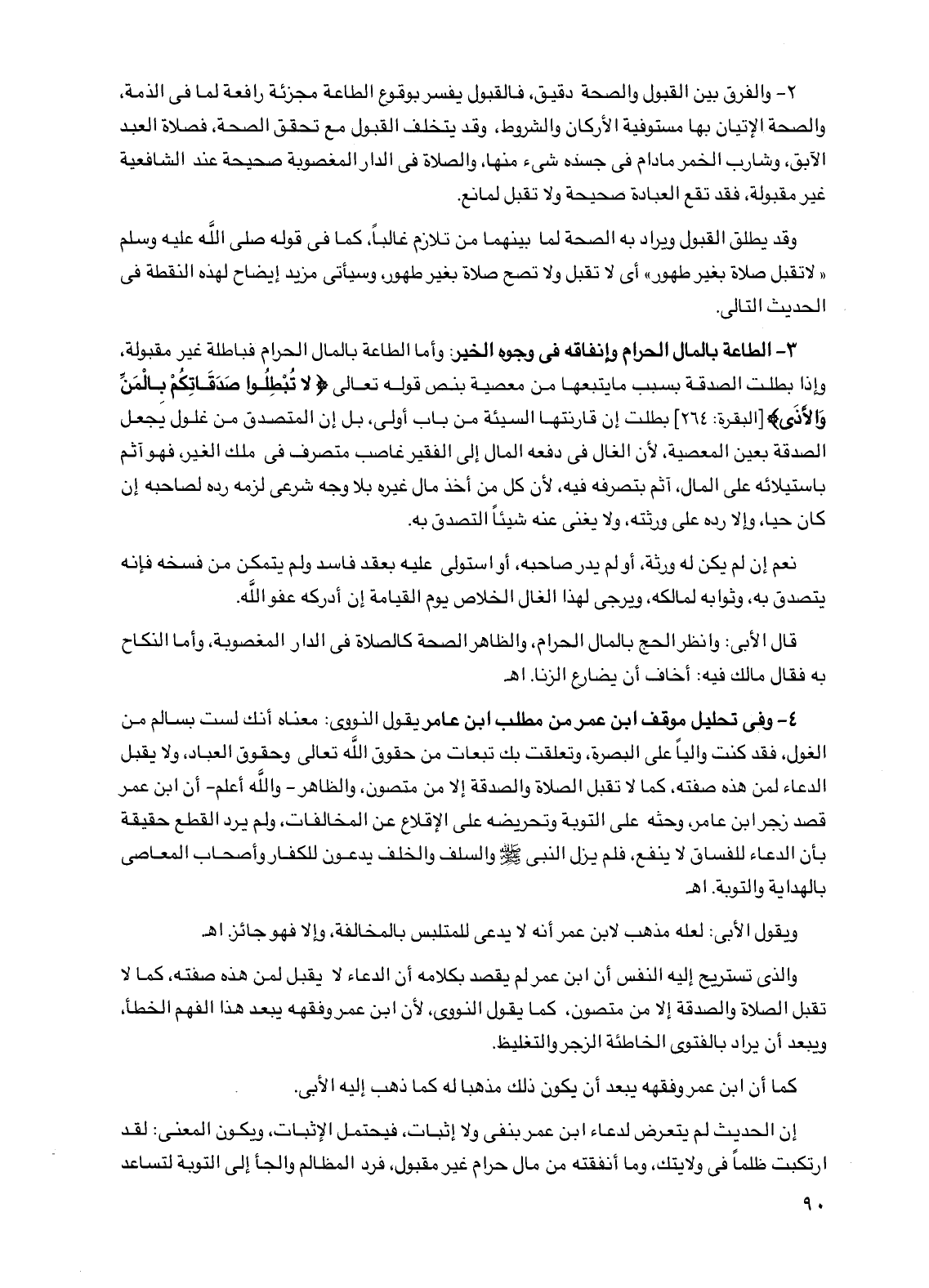 2 - والفرق بين القبول والصحة دقيق، فالقبول يفسر بوقوع الطاعة مجزئة رافعة لما في الذمة، والصحة الإتيان بها مستوفية الأركان والشروط، وقد يتخلف القبول مع تحقق الصحة، فصلاة العبد الآبق، وشارب الخمر مادام في جسده شيء منها، والصلاة في الدار المغصوبة صحيحة عند الشافعية غير مقبولة، فقد تقع العبادة صحيحة ولا تقبل لمانع.
