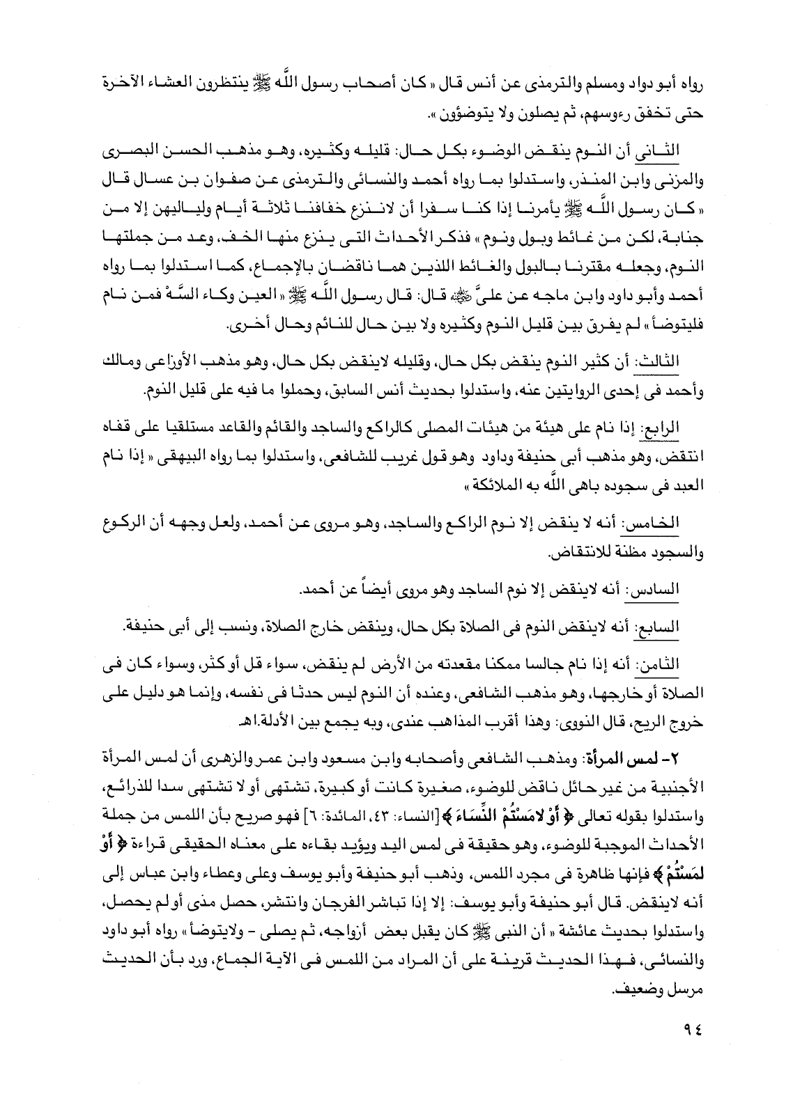 الثاني أن النوم ينقض الوضوء بكل حال: قليله وكثيره، وهو مذهب الحسن البصري والمزني وابن المنذر، واستدلوا بما رواه أحمد والنسائي والترمذي عن صفوان بن عسال قال "كان رسول الله صلى الله عليه وسلم يأمرنا إذا كنا سفرا أن لا ننزع خفافنا ثلاثة أيام ولياليهن إلا من جنابة، لكن من غائط وبول ونوم" فذكر الأحداث التي ينزع منها الخف، وعد من جملتها النوم، وجعله مقترنا بالبول والغائط اللذين هما ناقضان بالإجماع، كما استدلوا بما رواه أحمد وأبو داود وابن ماجه عن علي رضي الله عنه قال: قال رسول الله صلى الله عليه وسلم "العين وكاء السه فمن نام فليتوضأ" لم يفرق بين قليل النوم وكثيره ولا بين حال للنائم وحال أخرى.
