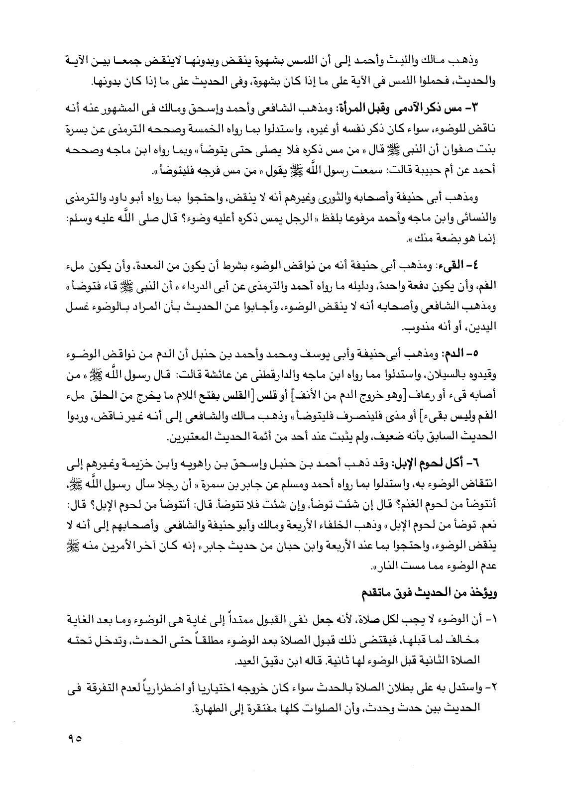 3 - مس ذكر الآدمي وقبل المرأة: ومذهب الشافعي وأحمد وإسحق ومالك في المشهور عنه أنه ناقض للوضوء، سواء كان ذكر نفسه أو غيره، واستدلوا بما رواه الخمسة وصححه الترمذي عن بسرة بنت صفوان أن النبي صلى الله عليه وسلم قال "من مس ذكره فلا يصلي حتى يتوضأ" وبما رواه ابن ماجه وصححه أحمد عن أم حبيبة قالت: سمعت رسول الله صلى الله عليه وسلم يقول "من مس فرجه فليتوضأ".
