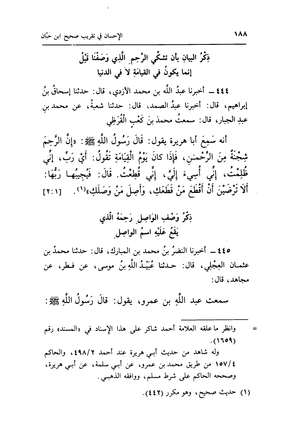ذِكْرُ الْبَيَانِ بِأَنَّ تَشَكِّي الرَّحِمِ الَّذِي وَصَفْنَا قَبْلُ إِنَّمَا يَكُونُ فِي الْقِيَامَةِ لَا فِي الدُّنْيَا
