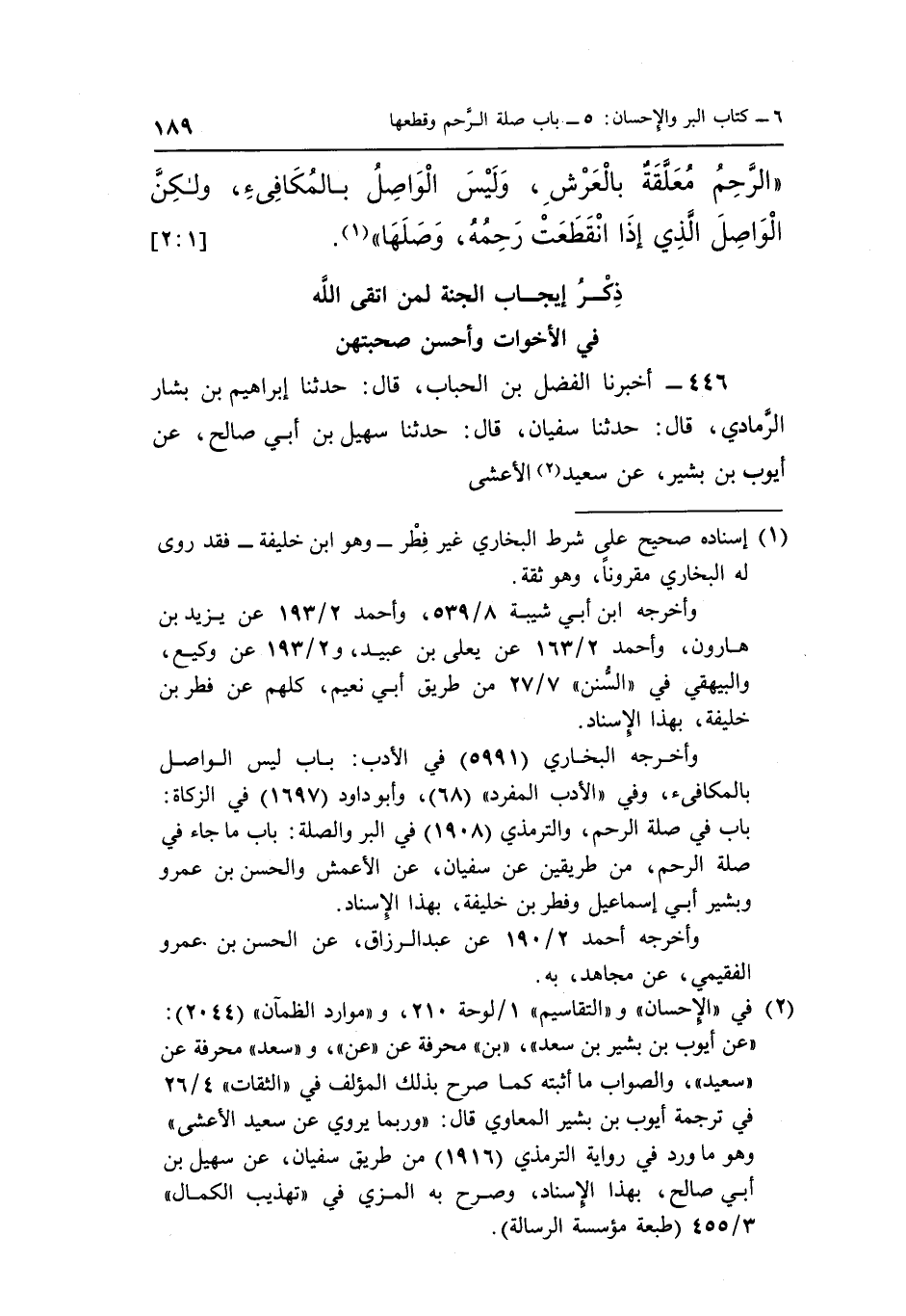 2 في "الإحسان" و"التقاسيم" 1/لوحة 210، و"موارد الظمآن" "2044": "عن أيوب بن بشير بن سعد"، "بن" محرفة عن "عن"، و"سعد" محرفة عن "سعيد"، والصواب ما أثبته كما صرح بذلك المؤلف في "الثقات" 4/26 في ترجمة أيوب بن بشير المعاوي قال: "وربما يروي عن سعيد الأعشى" وهو ما ورد في رواية الترمذي "1916" من طريق سفيان، عن سهيل بن أبي صالح، بهذا الإسناد، وصرح به المزي في "تهذيب الكمال" 3/455 "طبعة مؤسسة الرسالة".