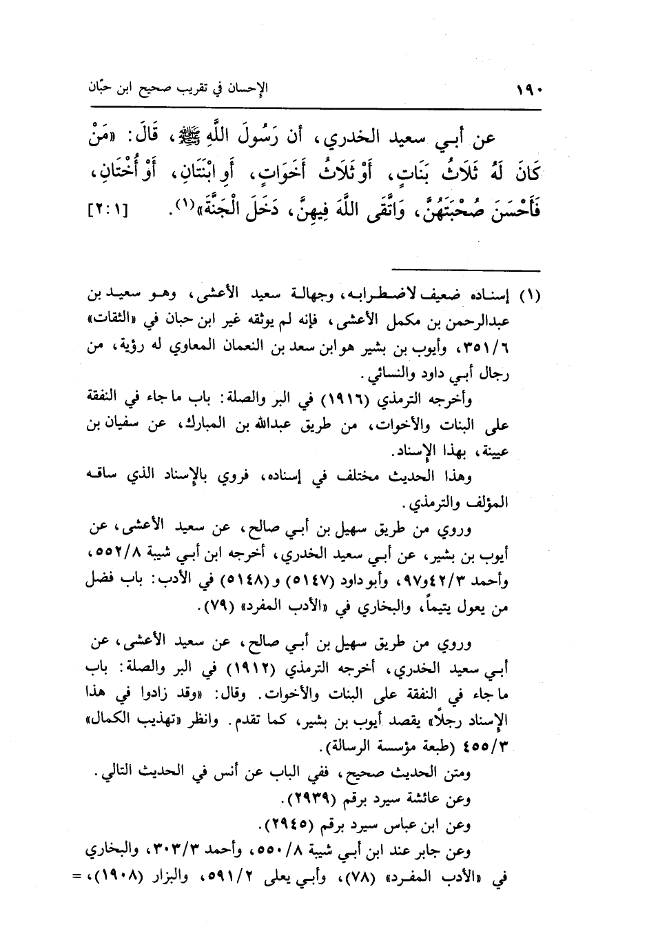 عَنْ أَبِي سَعِيدٍ الْخُدْرِيِّ أَنَّ رَسُولَ اللَّهِ صَلَّى اللَّهُ عَلَيْهِ وَسَلَّمَ قَالَ " مَنْ كَانَ لَهُ ثَلَاثُ بَنَاتٍ أَوْ ثَلَاثُ أَخَوَاتٍ أَوِ ابْنَتَانِ أَوْ أُخْتَانِ فَأَحْسَنَ صُحْبَتَهُنَّ وَاتَّقَى اللَّهَ فيهن دخل الجنة" 1. [1: 2]