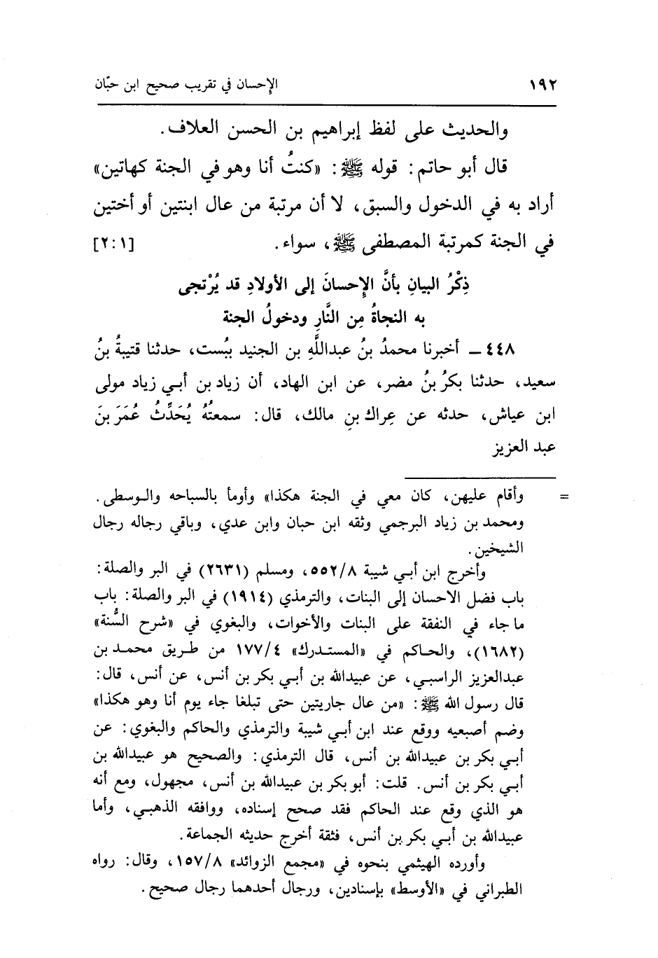 وَالْحَدِيثُ عَلَى لَفْظِ إِبْرَاهِيمَ بْنِ الْحَسَنِ الْعَلَّافِ قَالَ أَبُو حَاتِمٍ قَوْلُهُ صَلَّى اللَّهُ عَلَيْهِ وَسَلَّمَ "كُنْتُ أَنَا وَهُوَ فِي الْجَنَّةِ كَهَاتَيْنِ" أَرَادَ بِهِ فِي الدُّخُولِ وَالسَّبْقِ لَا أَنَّ مَرْتَبَةَ مَنْ عَالَ ابْنَتَيْنِ أَوْ أُخْتَيْنِ فِي الْجَنَّةِ كَمَرْتَبَةِ الْمُصْطَفَى صَلَّى اللَّهُ عَلَيْهِ وَسَلَّمَ سواء. [1: 2]