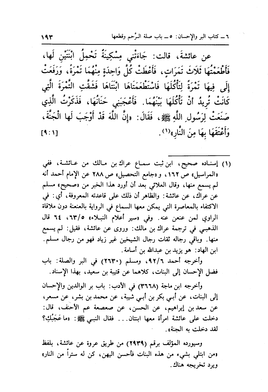 وأخرجه ابن ماجة "3668" في الأدب: باب بر والوالدين والإحسان إلى البنات، عن أبي بكر بن أبي شيبة، عن محمد بن بشر، عن مسعر، عن سعد بن إبراهيم، عن الحسن، عن صعصعة عم الأحنف، قال: دخلت على عائشة امرأة معها ابنتان ... فقال النبي صلى الله عليه وسلم: "ما عَجَبُكِ؟ لقد دخلت به الجنة".
