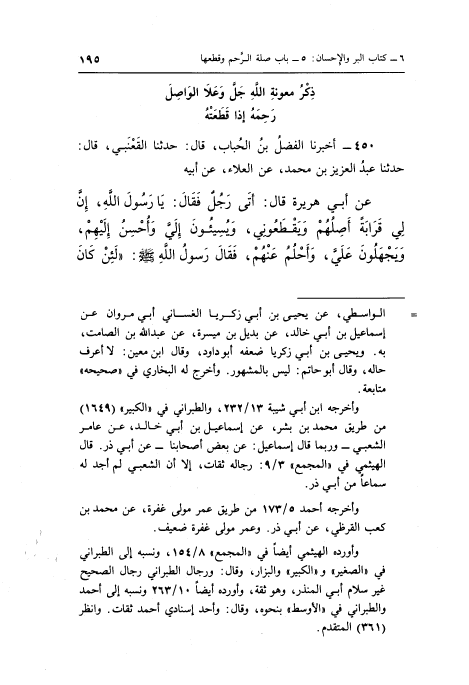 450 - أَخْبَرَنَا الْفَضْلُ بْنُ الْحُبَابِ قَالَ حَدَّثَنَا الْقَعْنَبِيُّ قَالَ حَدَّثَنَا عَبْدُ الْعَزِيزِ بْنُ مُحَمَّدٍ عَنِ الْعَلَاءِ عَنْ أَبِيهِ عَنْ أَبِي هُرَيْرَةَ قَالَ أَتَى رَجُلٌ فقَالَ يَا رَسُولَ اللَّهِ إِنَّ لِي قَرَابَةً أَصِلُهُمْ وَيَقْطَعُونِي وَيُسِيئُونَ إِلَيَّ وَأُحْسِنُ إِلَيْهِمْ وَيَجْهَلُونَ عَلَيَّ وَأَحْلُمُ عَنْهُمْ فَقَالَ رَسُولُ اللَّهِ صَلَّى اللَّهُ عَلَيْهِ وَسَلَّمَ "لئن كانذكر مَعُونَةِ اللَّهِ جَلَّ وَعَلَا الْوَاصِلَ رَحِمَهُ إِذَا قَطَعَتْهُ