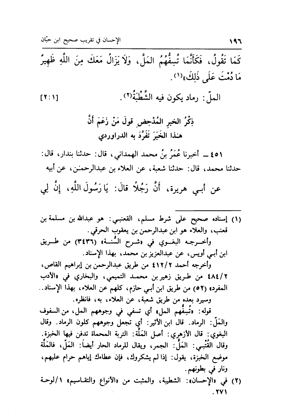 451 - أَخْبَرَنَا عُمَرُ بْنُ مُحَمَّدٍ الْهَمْدَانِيُّ قَالَ حَدَّثَنَا بُنْدَارٌ قَالَ حَدَّثَنَا مُحَمَّدٌ قَالَ حَدَّثَنَا شُعْبَةُ عَنِ الْعَلَاءِ بْنِ عَبْدِ الرَّحْمَنِ عَنْ أَبِيهِ