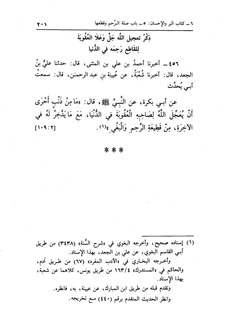 عَنْ أَبِي بَكْرَةَ عَنِ النَّبِيِّ صَلَّى اللَّهُ عَلَيْهِ وَسَلَّمَ قَالَ "مَا مِنْ ذَنْبٍ أَحْرَى أَنْ يُعَجِّلَ اللَّهُ لِصَاحِبِهِ الْعُقُوبَةَ فِي الدُّنْيَا مَعَ مَا يَدَّخِرُ لَهُ فِي الْآخِرَةِ مِنْ قَطِيعَةِ الرَّحِمِ والبغي" 1. [2: 109]
