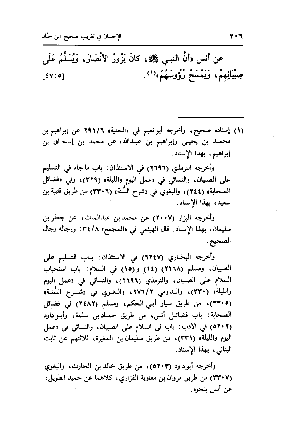 عَنْ أَنَسٍ "أَنَّ النَّبِيَّ صَلَّى اللَّهُ عَلَيْهِ وَسَلَّمَ كَانَ يَزُورُ الْأَنْصَارَ وَيُسَلِّمُ عَلَى صِبْيَانِهِمْ ويمسح رؤوسهم" 1.