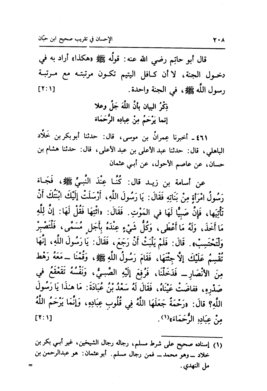 عَنْ أُسَامَةَ بْنِ زَيْدٍ قَالَ كُنَّا عِنْدَ النَّبِيِّ صَلَّى اللَّهُ عَلَيْهِ وَسَلَّمَ فَجَاءَ رَسُولُ امْرَأَةٍ مِنْ بَنَاتِهِ فقَالَ يَا رَسُولَ اللَّهِ أَرْسَلَتْ إِلَيْكَ ابْنَتُكَ أَنْ تَأْتِيَهَا فَإِنَّ صَبِيًّا لَهَا فِي الْمَوْتِ فقَالَ " ائْتِهَا فَقُلْ لَهَا إِنَّ لِلَّهِ مَا أَخَذَ وَلَهُ مَا أَعْطَى وَكُلُّ شَيْءٍ عِنْدَهُ بِأَجَلٍ مُسَمًّى فَلْتَصْبِرْ وَلْتَحْتَسِبْ قَالَ فَلَمْ يَلْبَثْ أَنْ رَجَعَ فقَالَ يَا رَسُولَ اللَّهِ إِنَّهَا تُقْسِمُ عَلَيْكَ إِلَّا جِئْتَهَا فَقَامَ رَسُولُ اللَّهِ صَلَّى اللَّهُ عَلَيْهِ وَسَلَّمَ وَقُمْنَا مَعَهُ رَهْطٌ مِنَ الْأَنْصَارِ فَدَخَلْنَا فَرُفِعَ إِلَيْهِ الصَّبِيُّ وَنَفْسُهُ تَقَعْقَعُ فِي صَدْرِهِ فَفَاضَتْ عَيْنَاهُ فقَالَ لَهُ سَعْدُ بْنُ عُبَادَةَ مَا هَذَا يَا رَسُولَ اللَّهِ قَالَ رَحْمَةٌ جَعَلَهَا اللَّهُ فِي قُلُوبِ عِبَادِهِ وَإِنَّمَا يَرْحَمُ اللَّهُ مِنْ عِبَادِهِ الرحماء" 1.