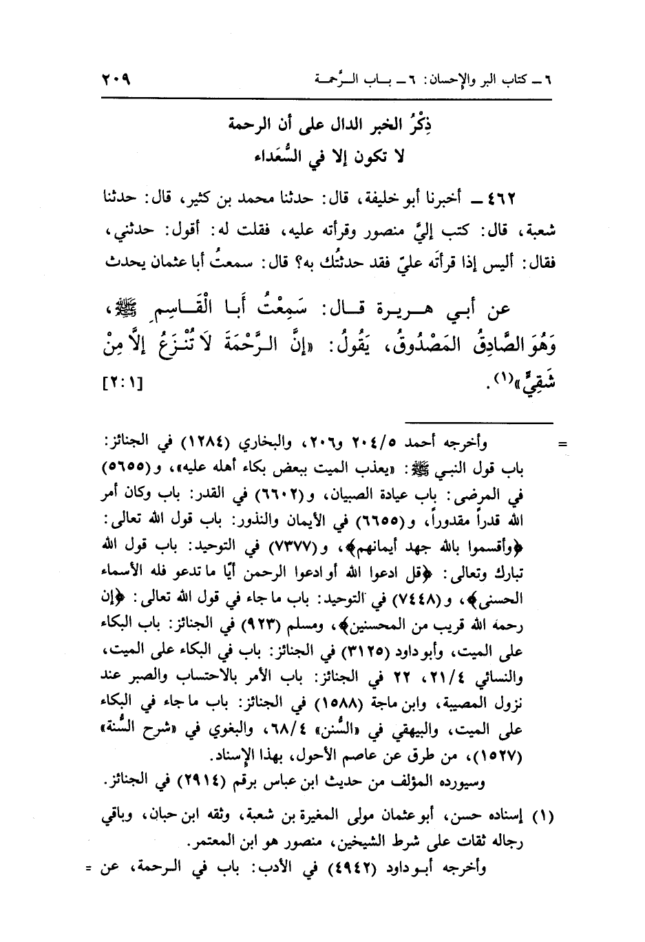 عَنْ أَبِي هُرَيْرَةَ قَالَ سَمِعْتُ أَبَا الْقَاسِمِ صَلَّى اللَّهُ عَلَيْهِ وَسَلَّمَ وَهُوَ الصَّادِقُ الْمَصْدُوقُ يَقُولُ "إِنَّ الرَّحْمَةَ لَا تنزع إلا من شقي" 1. [1: 2]