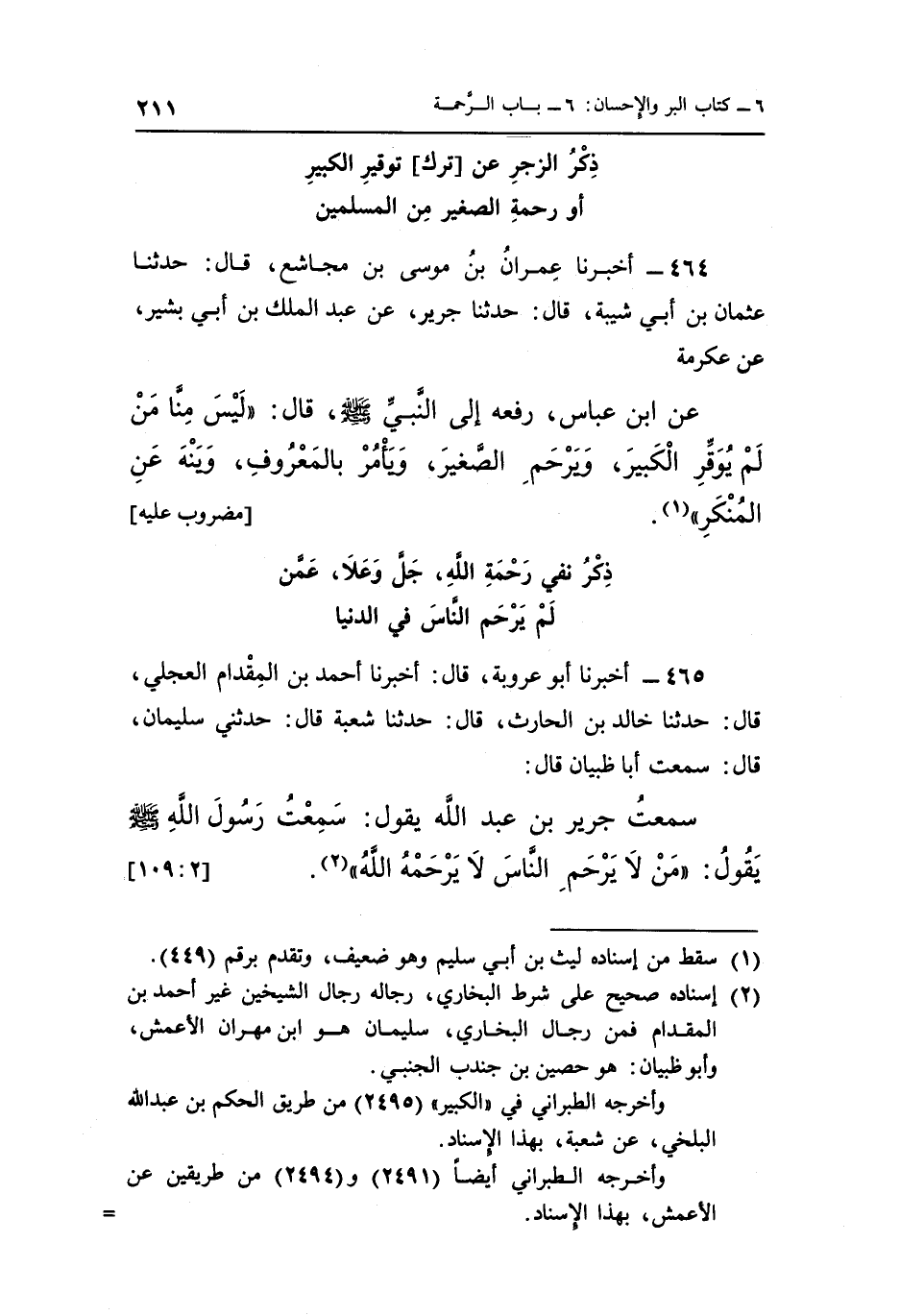 سَمِعْتُ جَرِيرَ بْنَ عَبْدِ اللَّهِ يَقُولُ سَمِعْتُ رَسُولَ اللَّهِ صَلَّى اللَّهُ عَلَيْهِ وَسَلَّمَ يَقُولُ "مَنْ لَا يَرْحَمِ النَّاسَ لَا يرحمه الله" 2. [2: 109]