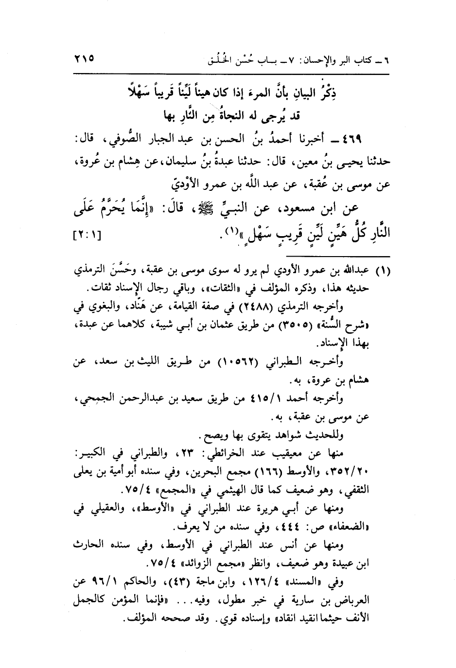 عن بْنِ مَسْعُودٍ عَنِ النَّبِيِّ صَلَّى اللَّهُ عَلَيْهِ وَسَلَّمَ قَالَ "إِنَّمَا يُحَرَّمُ عَلَى النَّارِ كُلُّ هَيِّنٍ لين قريب سهل" 1. [1: 2]