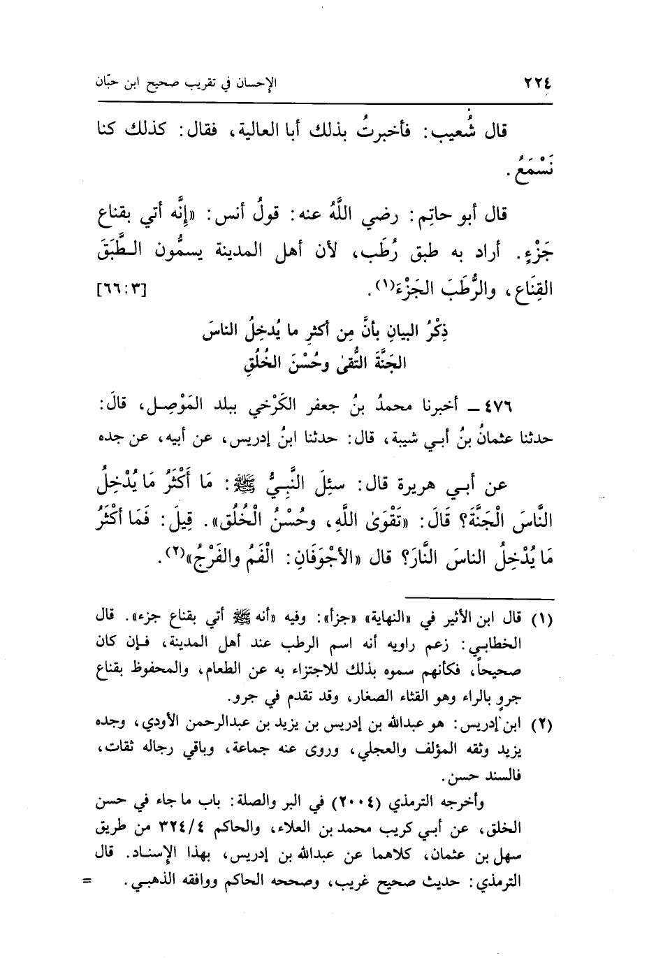 عَنْ أَبِي هُرَيْرَةَ قَالَ سُئِلَ النَّبِيُّ صَلَّى اللَّهُ عَلَيْهِ وَسَلَّمَ مَا أَكْثَرُ مَا يُدْخِلُ النَّاسَ الْجَنَّةَ قَالَ "تَقْوَى اللَّهِ وَحُسْنُ الْخُلُقِ" قِيلَ فَمَا أَكْثَرُ مَا يُدْخِلُ النَّاسَ النَّارَ قَالَ "الْأَجْوَفَانِ الفم والفرج" 2.