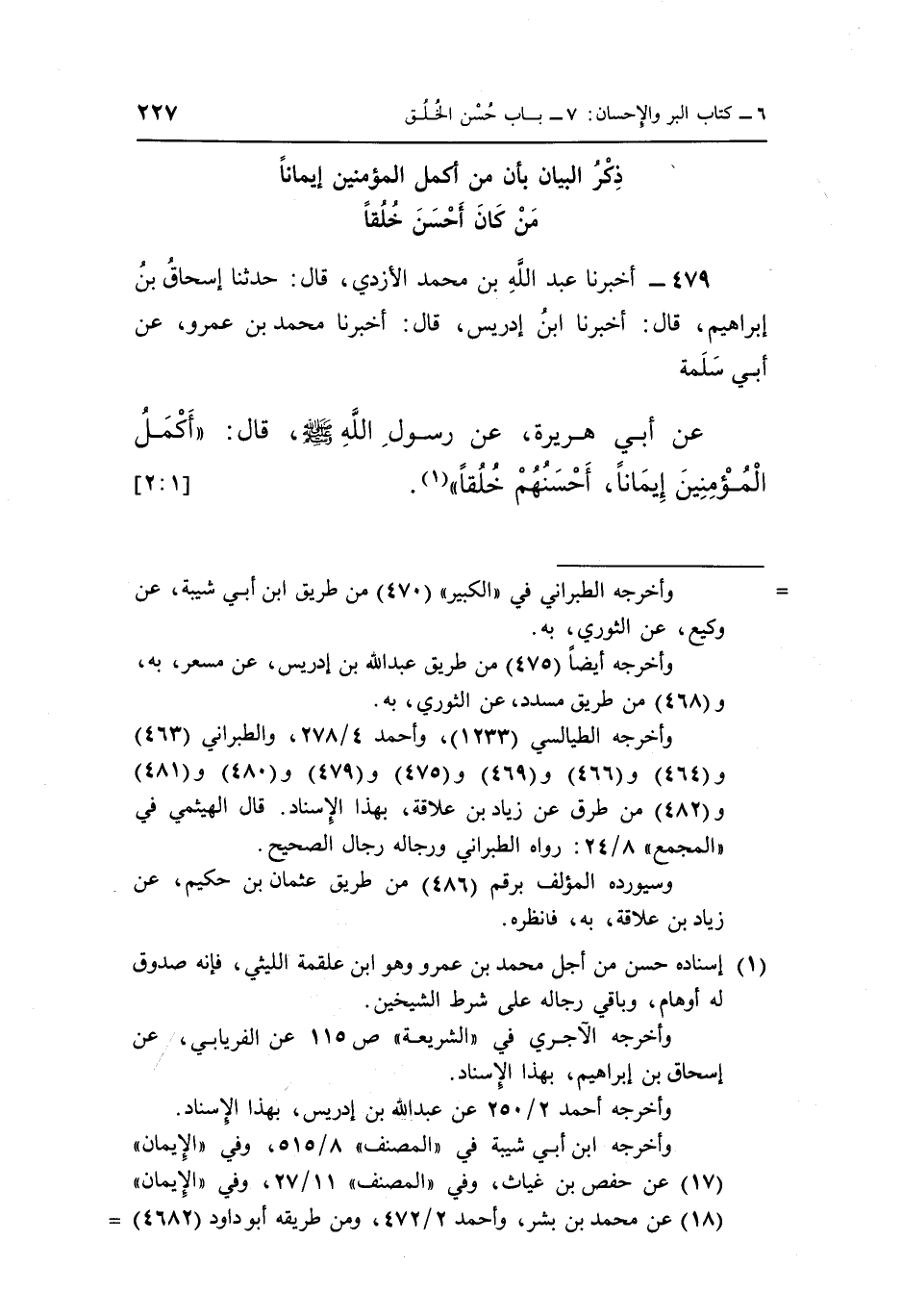 عَنْ أَبِي هُرَيْرَةَ عَنْ رَسُولِ اللَّهِ صَلَّى اللَّهُ عَلَيْهِ وَسَلَّمَ قَالَ "أَكْمَلُ المؤمنين إيمانا أحسنهم خلقا" 1. [1: 2]
