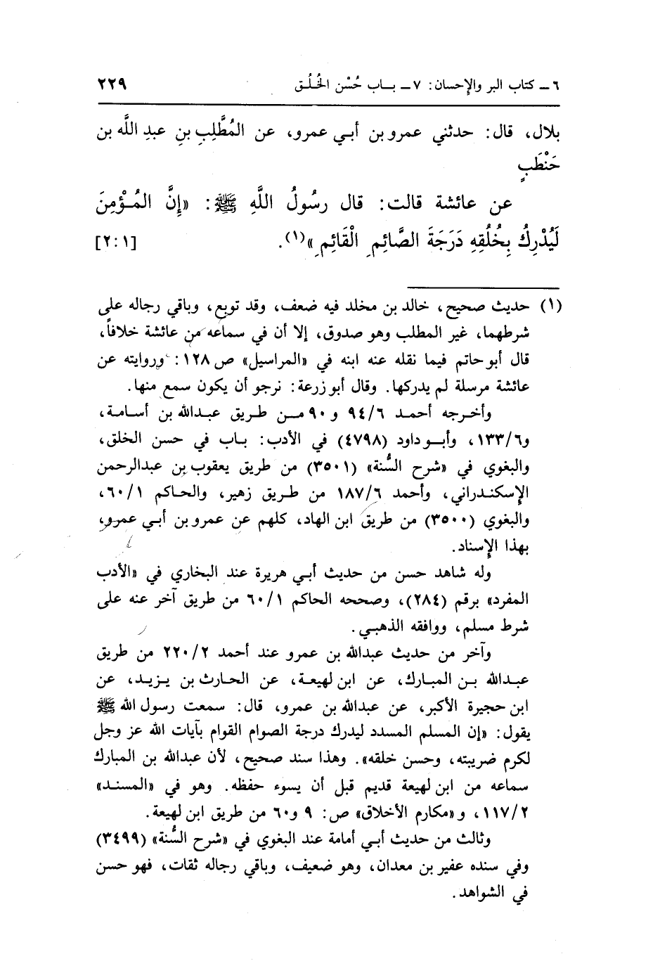 عَنْ عَائِشَةَ قَالَتْ قَالَ رَسُولُ اللَّهِ صَلَّى اللَّهُ عَلَيْهِ وَسَلَّمَ "إِنَّ الْمُؤْمِنَ لَيُدْرِكُ بِخُلُقِهِ درجة الصائم القائم" 1.