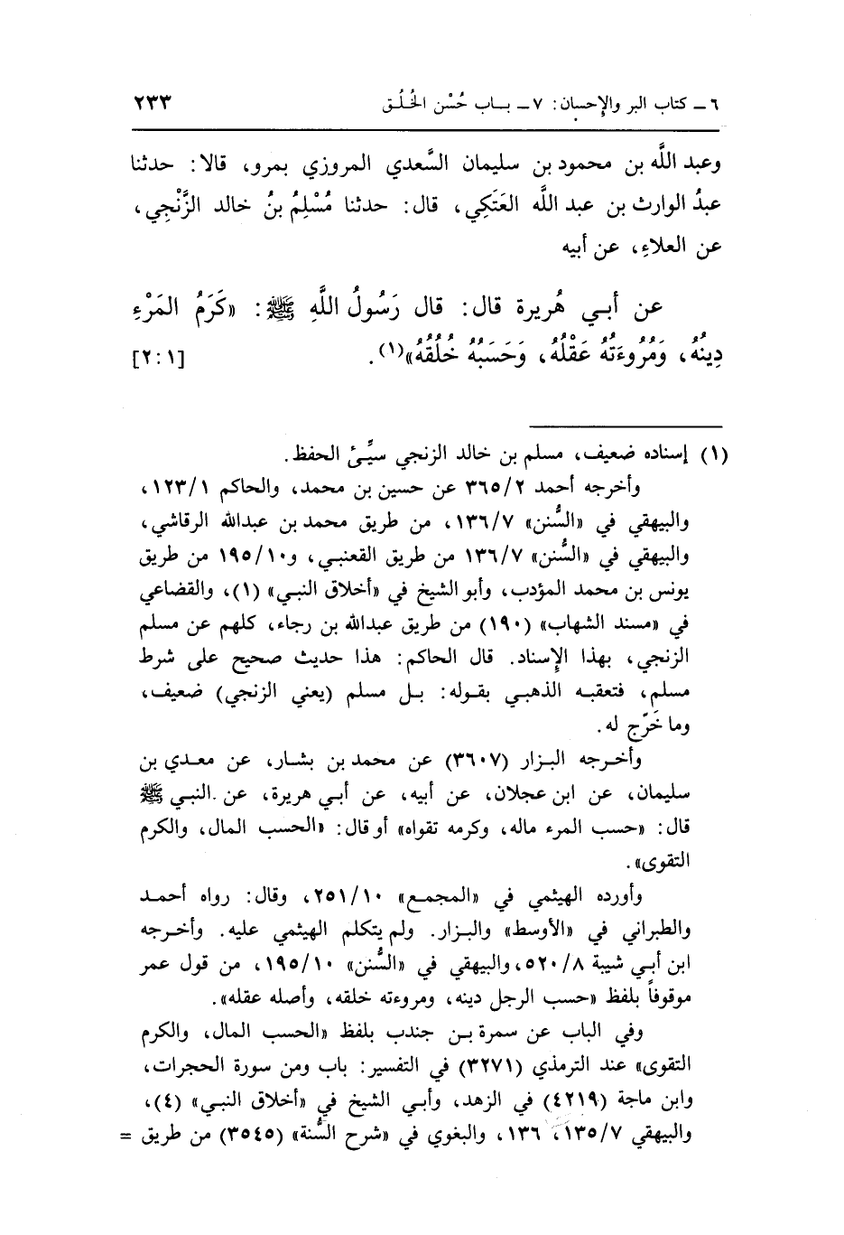 عَنْ أَبِي هُرَيْرَةَ قَالَ قَالَ رَسُولُ اللَّهِ صَلَّى اللَّهُ عَلَيْهِ وَسَلَّمَ "كَرَمُ الْمَرْءِ دِينُهُ وَمُرُوءَتُهُ عَقْلُهُ وحسبه خلقه" 1.