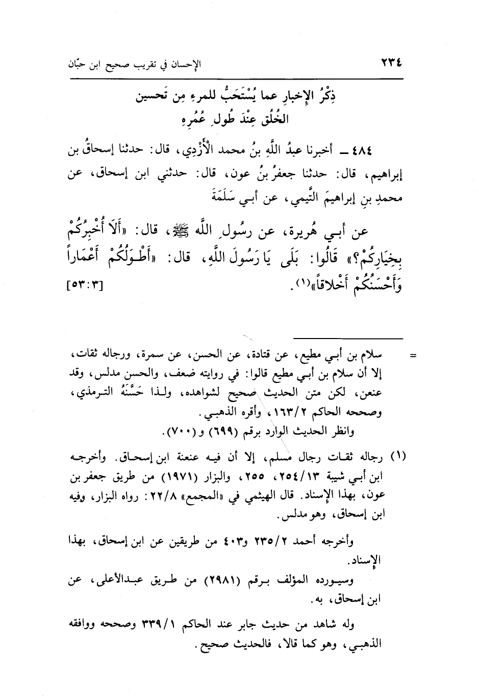 عَنْ أَبِي هُرَيْرَةَ عَنْ رَسُولِ اللَّهِ صَلَّى اللَّهُ صَلَّى اللَّهُ عَلَيْهِ وَسَلَّمَ قَالَ "أَلَا أُخْبِرُكُمْ بِخِيَارِكُمْ قَالُوا بَلَى يَا رَسُولَ اللَّهِ قَالَ أَطْوَلُكُمْ أَعْمَارًا وَأَحْسَنُكُمْ أَخْلَاقًا" 1. [3: 53]