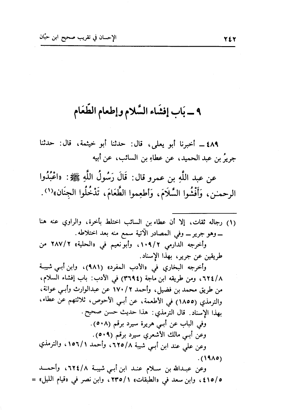 عَنْ عَبْدِ اللَّهِ بْنِ عَمْرٍو قَالَ قَالَ رَسُولُ اللَّهِ صَلَّى اللَّهُ عَلَيْهِ وَسَلَّمَ "اعْبُدُوا الرَّحْمَنَ وَأَفْشُوا السَّلَامَ وَأَطْعِمُوا الطعام تدخلوا الجنان" 1.