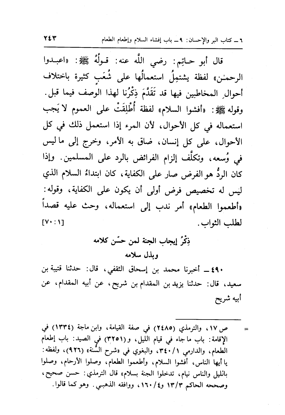 قال أبو حاتم رضى الله تعالى عَنْهُ قَوْلُهُ صَلَّى اللَّهُ عَلَيْهِ وَسَلَّمَ "اعْبُدُوا الرَّحْمَنَ" لَفْظَةٌ يَشْتَمِلُ اسْتِعْمَالُهَا عَلَى شُعَبٍ كَثِيرَةٍ بِاخْتِلَافِ أَحْوَالِ الْمُخَاطَبِينَ فِيهَا قَدْ تَقَدَّمَ ذِكْرُنَا لِهَذَا الْوَصْفِ فِيمَا قَبْلُ وَقَوْلُهُ صَلَّى اللَّهُ عَلَيْهِ وَسَلَّمَ "أَفْشُوا السَّلَامَ" لَفْظَةٌ أُطْلِقَتْ عَلَى الْعُمُومِ لَا يَجِبُ اسْتِعْمَالُهُ فِي كُلِّ الْأَحْوَالِ لِأَنَّ الْمَرْءَ إِذَا اسْتَعْمَلَ ذَلِكَ فِي كُلِّ الْأَحْوَالِ عَلَى كُلِّ إِنْسَانٍ ضَاقَ بِهِ الْأَمْرُ وَخَرَجَ إِلَى مَا لَيْسَ فِي وُسْعِهِ وَتَكَلَّفَ إلْزَامَ الْفَرَائِضِ بِالرَّدِّ عَلَى الْمُسْلِمِينَ وَإِذَا كَانَ الرَّدُّ هُوَ الْفَرْضُ صَارَ عَلَى الْكِفَايَةِ كَانَ ابْتِدَاءُ السَّلَامِ الَّذِي لَيْسَ لَهُ تَخْصِيصٌ فَرْضٌ أَوْلَى أَنْ يَكُونَ عَلَى الْكِفَايَةِ وَقَوْلُهُ "أَطْعِمُوا الطَّعَامَ" أَمْرٌ نُدِبَ إِلَى اسْتِعْمَالِهِ وَحُثَّ عَلَيْهِ قصدا لطلب الثواب. [1: 7]