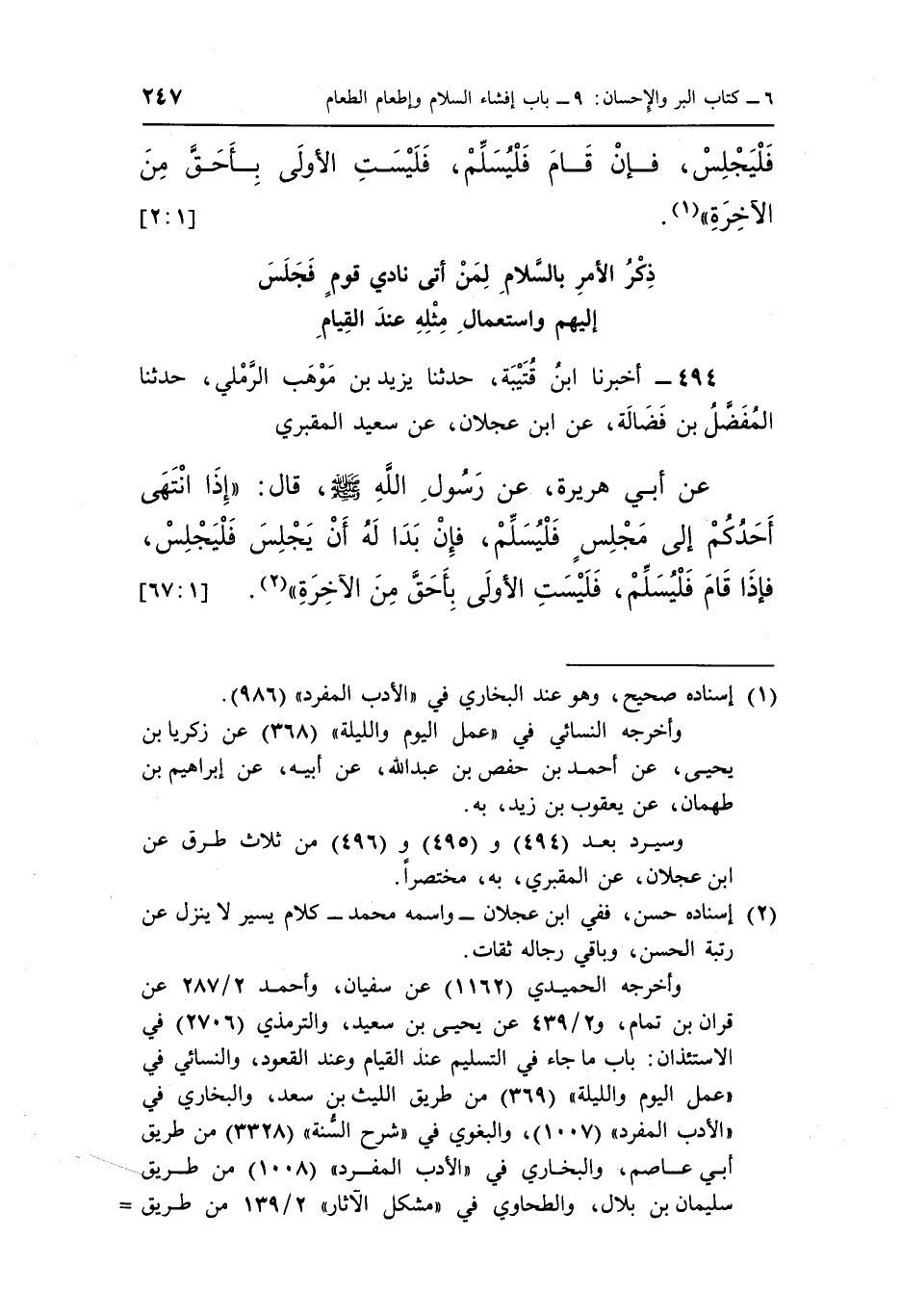 عَنْ أَبِي هُرَيْرَةَ عَنِ رَسُولِ اللَّهِ صَلَّى اللَّهُ عَلَيْهِ وَسَلَّمَ قَالَ "إِذَا انْتَهَى أَحَدُكُمْ إِلَى مَجْلِسٍ فَلْيُسَلِّمْ فَإِنْ بَدَا لَهُ أَنْ يَجْلِسَ فَلْيَجْلِسْ فَإِذَا قَامَ فَلْيُسَلِّمْ فَلَيْسَتِ الْأُولَى بِأَحَقَّ مِنَ الآخرة" 2. [1: 67]