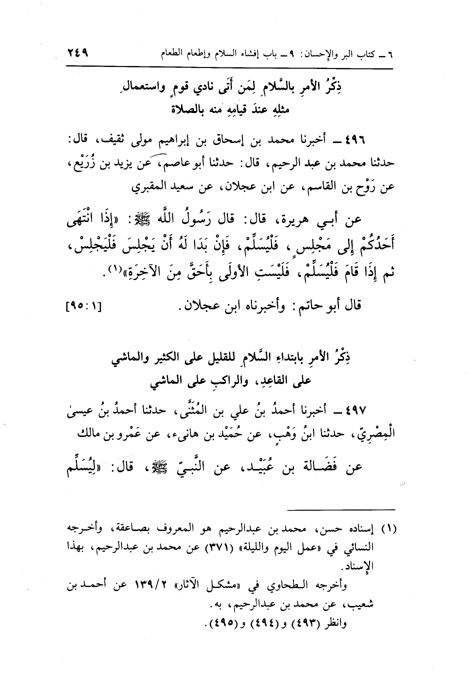 496 - أَخْبَرَنَا مُحَمَّدُ بْنُ إِسْحَاقَ بْنِ إِبْرَاهِيمَ مَوْلَى ثَقِيفٍ قَالَ حَدَّثَنَا مُحَمَّدُ بْنُ عَبْدِ الرَّحِيمِ قَالَ حَدَّثَنَا أَبُو عَاصِمٍ عَنْ يَزِيدَ بْنِ زُرَيْعٍ عن روح بن القاسم عن بْنِ عَجْلَانَ عَنْ سَعِيدٍ الْمَقْبُرِيِّ