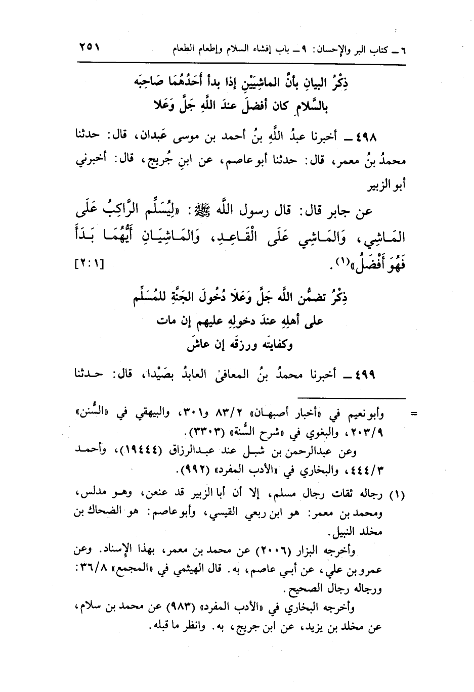 عَنْ جَابِرٍ قَالَ قَالَ رَسُولُ اللَّهِ صَلَّى اللَّهُ عَلَيْهِ وَسَلَّمَ "لِيُسَلِّمِ الرَّاكِبُ عَلَى الْمَاشِي وَالْمَاشِي عَلَى القاعد والماشيان أيهما بدأ فهو أفضل" 1. [1: 2]