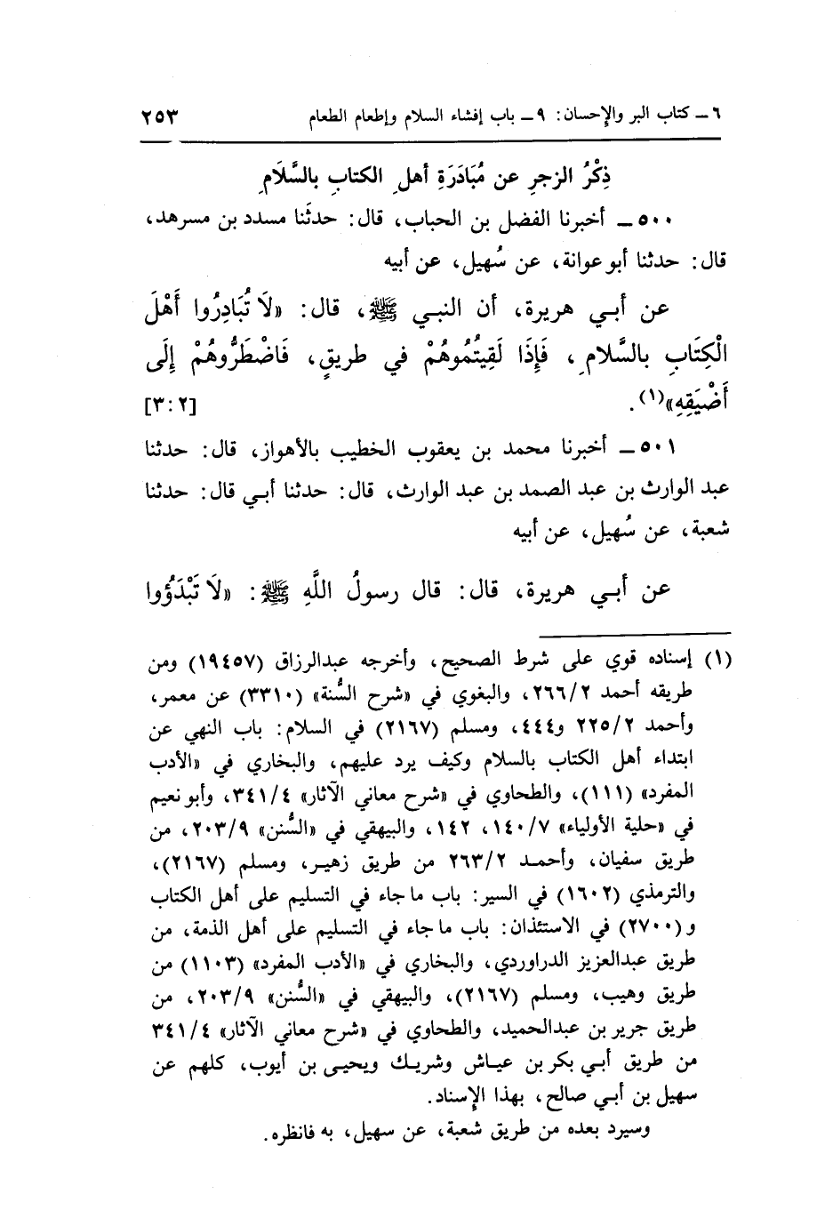 500 - أَخْبَرَنَا الْفَضْلُ بْنُ الْحُبَابِ قَالَ حَدَّثَنَا مُسَدَّدُ بْنُ مُسَرْهَدٍ قَالَ حَدَّثَنَا أَبُو عَوَانَةَ عَنْ سُهَيْلٍ عَنْ أَبِيهِ عَنْ أَبِي هُرَيْرَةَ أَنَّ النَّبِيَّ صَلَّى اللَّهُ عَلَيْهِ وَسَلَّمَ قَالَ "لا تُبَادِرُوا أَهْلَ الْكِتَابِ بِالسَّلَامِ فَإِذَا لَقِيتُمُوهُمْ فِي طريق فاضطروهم إلى أضيقه" 1. [2: 3]