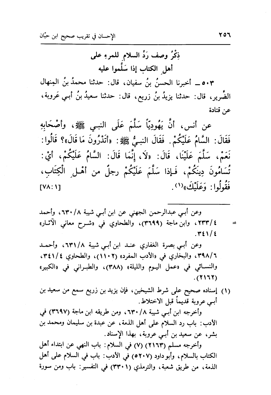 عَنْ أَنَسٍ أَنَّ يَهُودِيًّا سَلَّمَ عَلَى النَّبِيِّ صَلَّى اللَّهُ عَلَيْهِ وَسَلَّمَ وَأَصْحَابِهِ فقَالَ "السَّامُ عَلَيْكُمْ فقَالَ النَّبِيُّ صَلَّى اللَّهُ عَلَيْهِ وَسَلَّمَ أَتَدْرُونَ مَا قَالَ قَالُوا نَعَمْ سَلَّمَ عَلَيْنَا قَالَ لَا إِنَّمَا قَالَ السَّامُ عَلَيْكُمْ أَيْ تُسَامُونَ دِينَكُمْ فَإِذَا سَلَّمَ عَلَيْكُمْ رَجُلٌ مِنْ أَهْلِ الكتاب فقولوا وعليك" 1. [1: 78]