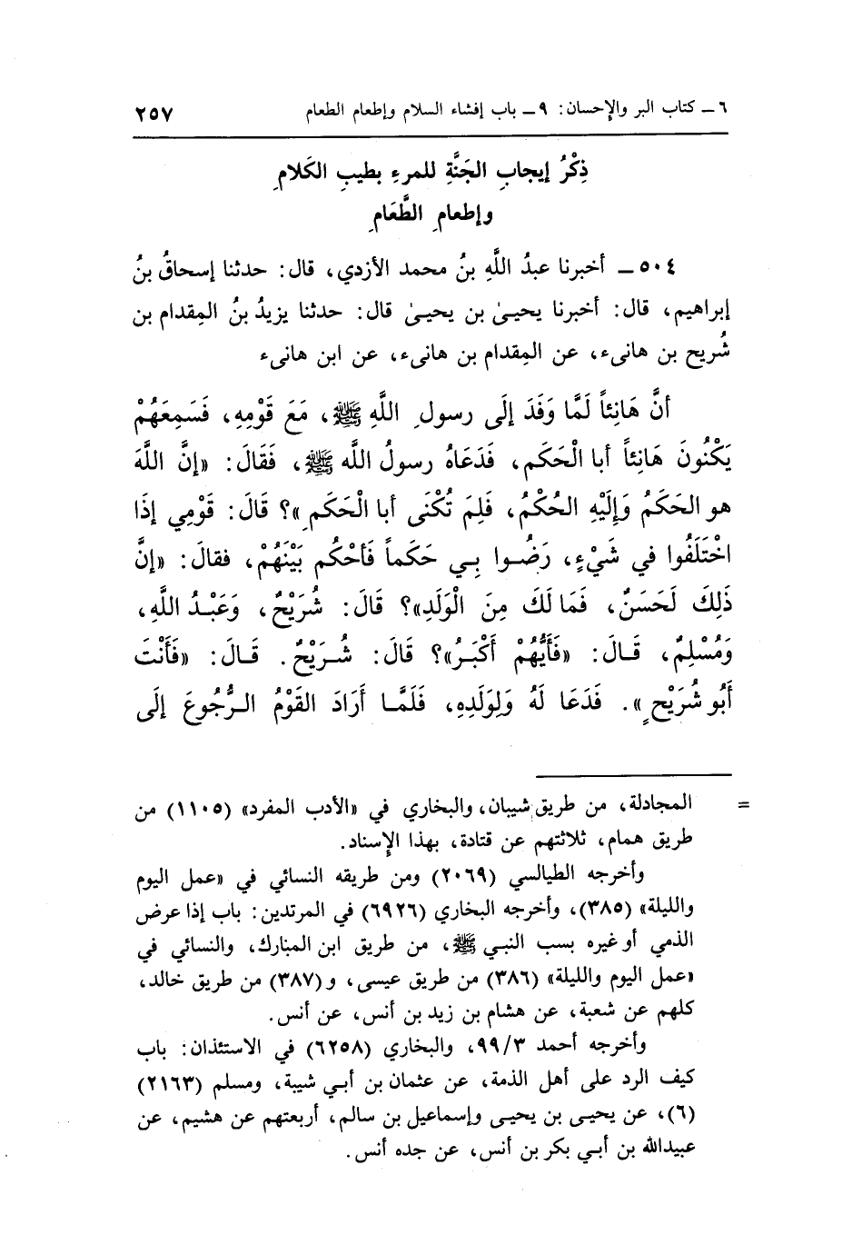 504 - أَخْبَرَنَا عَبْدُ اللَّهِ بْنُ مُحَمَّدٍ الْأَزْدِيُّ قَالَ حَدَّثَنَا إِسْحَاقُ بْنُ إِبْرَاهِيمَ قَالَ أَخْبَرَنَا يَحْيَى بْنُ يَحْيَى قَالَ حَدَّثَنَا يَزِيدُ بْنُ الْمِقْدَامِ بْنِ شُرَيْحٍ بْنِ هَانِئٍ عَنِ الْمِقْدَامِ بْنِ هانئ عن بن هَانِئٍ أَنَّ هَانِئًا لَمَّا وَفَدَ إِلَى رَسُولِ اللَّهِ صَلَّى اللَّهُ عَلَيْهِ وَسَلَّمَ مَعَ قَوْمِهِ فَسَمِعَهُمْ يُكَنُّونَ هَانِئًا أَبَا الْحَكَمِ فَدَعَاهُ رَسُولُ اللَّهِ صَلَّى اللَّهُ عَلَيْهِ وَسَلَّمَ فقَالَ إِنَّ اللَّهَ هُوَ الْحَكَمُ وَإِلَيْهِ الْحُكْمُ فَلِمَ تُكَنَّى أَبَا الْحَكَمِ قَالَ قَوْمِي إِذَا اخْتَلَفُوا فِي شَيْءٍ رَضُوا بِي حَكَمًا فَأَحْكُمُ بَيْنَهُمْ فقَالَ إِنَّ ذَلِكَ لَحَسَنٌ فَمَا لَكَ مِنَ الْوَلَدِ قَالَ شُرَيْحٌ وَعَبْدُ اللَّهِ وَمُسْلِمٌ قَالَ فَأَيُّهُمْ أَكْبَرُ قَالَ شُرَيْحٌ قَالَ فَأَنْتَ أَبُو شُرَيْحٍ فَدَعَا لَهُ وَلِوَلَدِهِ فَلَمَّا أَرَادَ الْقَوْمُ الرُّجُوعَ إلىذكر إِيجَابِ الْجَنَّةِ لِلْمَرْءِ بِطِيبِ الْكَلَامِ وَإِطْعَامِ الطَّعَامِ