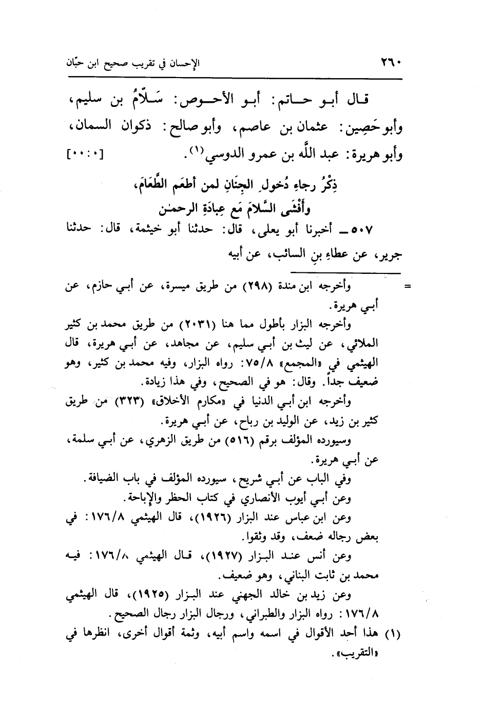 507 - أَخْبَرَنَا أَبُو يَعْلَى قَالَ حَدَّثَنَا أَبُو خَيْثَمَةَ قَالَ حَدَّثَنَا جَرِيرٌ عَنْ عَطَاءِ بْنِ السَّائِبِ عَنْ أبيهذكر رَجَاءِ دُخُولِ الْجِنَانِ لِمَنْ أَطْعَمَ الطَّعَامَ وَأَفْشَى السَّلَامَ مَعَ عِبَادَةِ الرَّحْمَنِ