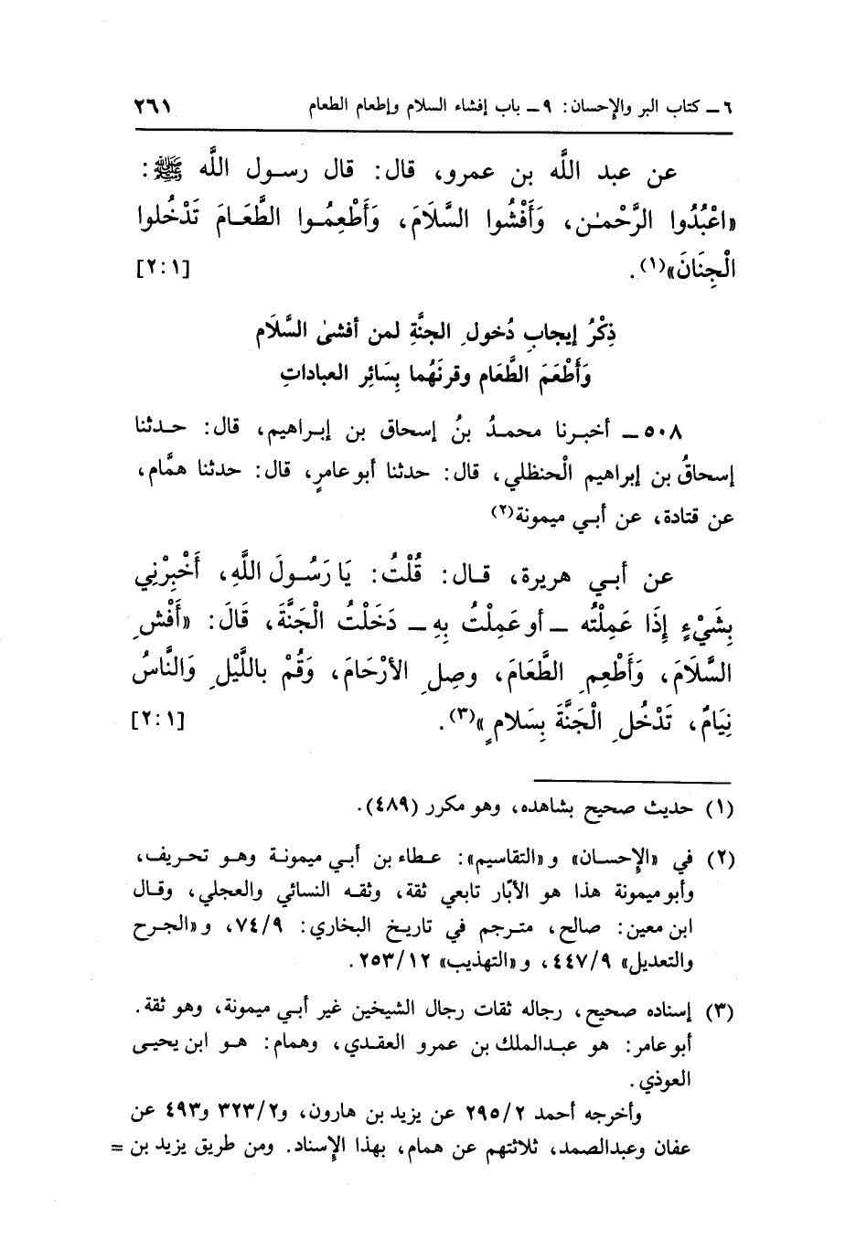 عَنْ عَبْدِ اللَّهِ بْنِ عَمْرٍو قَالَ قَالَ رَسُولُ اللَّهِ صَلَّى اللَّهُ عَلَيْهِ وَسَلَّمَ " اعْبُدُوا الرَّحْمَنَ وَأَفْشُوا السَّلَامَ وَأَطْعِمُوا الطَّعَامَ تَدْخُلُوا الْجِنَانَ" 1. [1:]