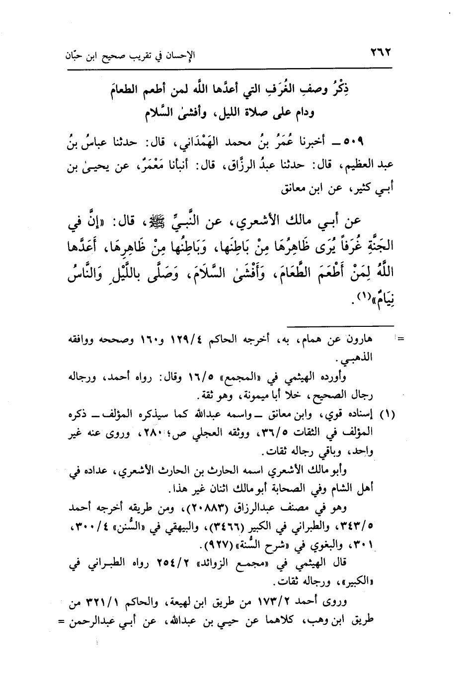 عَنْ أَبِي مَالِكٍ الْأَشْعَرِيِّ عَنِ النَّبِيِّ صَلَّى اللَّهُ عَلَيْهِ وَسَلَّمَ قَالَ "إِنَّ فِي الْجَنَّةِ غُرَفًا يُرَى ظَاهِرُهَا مِنْ بَاطِنِهَا وَبَاطِنُهَا مِنْ ظَاهِرِهَا أَعَدَّهَا اللَّهُ لِمَنْ أَطْعَمَ الطَّعَامَ وأفشى السلام وصلى بالليل والناس نيام" 1.