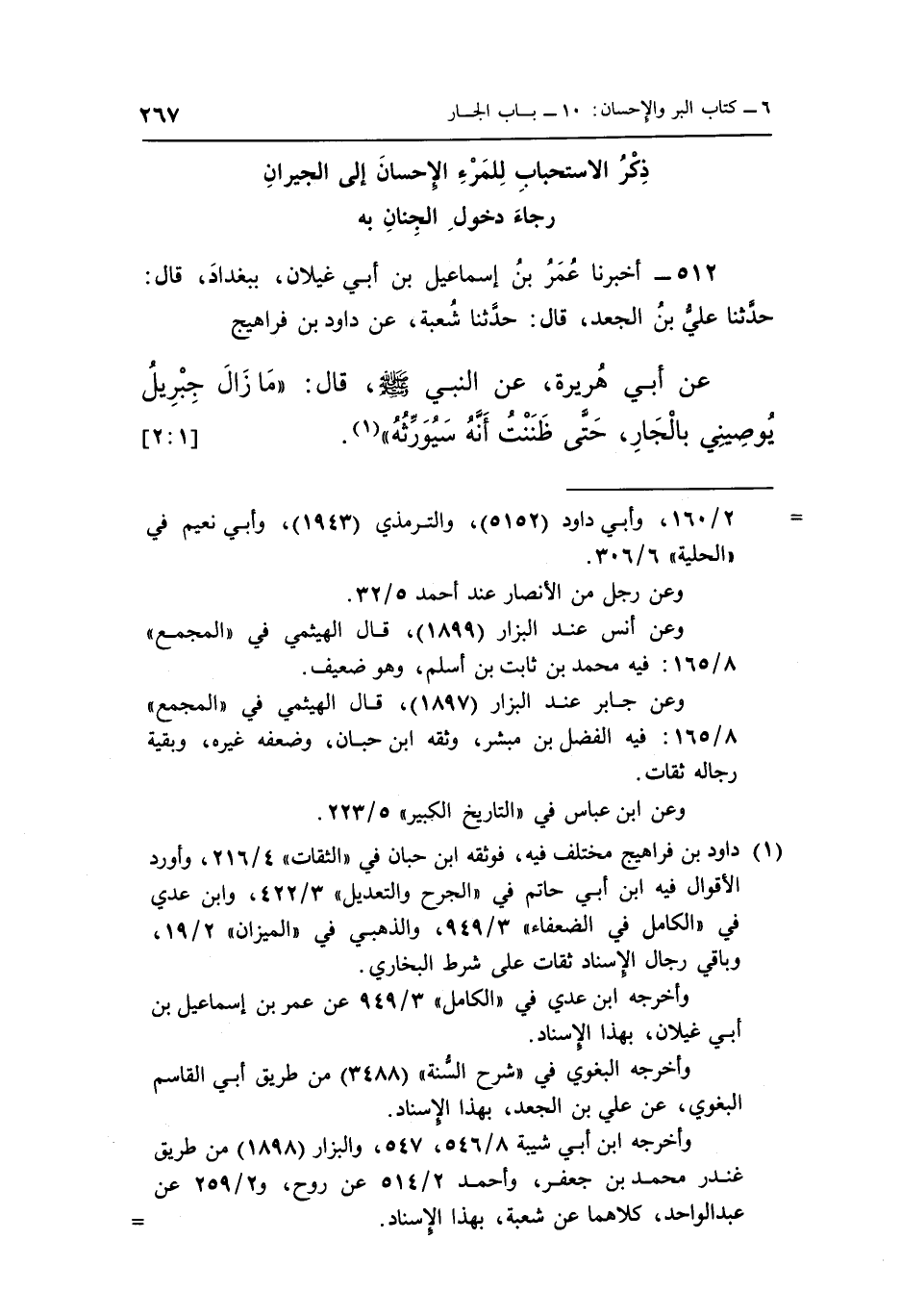 عَنْ أَبِي هُرَيْرَةَ عَنِ النَّبِيِّ صَلَّى اللَّهُ عَلَيْهِ وَسَلَّمَ قَالَ "مَا زَالَ جِبْرِيلُ يُوصِينِي بِالْجَارِ حَتَّى ظَنَنْتُ أَنَّهُ سَيُوَرِّثُهُ" 1.