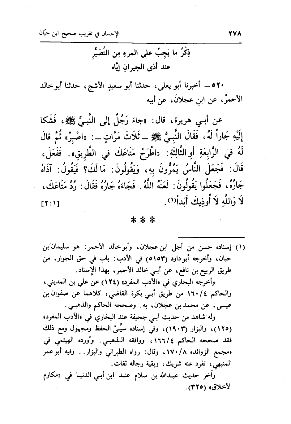 عَنْ أَبِي هُرَيْرَةَ قَالَ جَاءَ رَجُلٌ إِلَى النَّبِيِّ صَلَّى اللَّهُ عَلَيْهِ وَسَلَّمَ فَشَكَا إِلَيْهِ جَارًا لَهُ فقَالَ النَّبِيُّ صَلَّى اللَّهُ عَلَيْهِ وَسَلَّمَ ثَلَاثَ مَرَّاتٍ " اصْبِرْ ثُمَّ قَالَ لَهُ فِي الرَّابِعَةِ أَوِ الثَّالِثَةِ اطْرَحْ مَتَاعَكَ فِي الطَّرِيقِ فَفَعَلَ قَالَ فَجَعَلَ النَّاسُ يَمُرُّونَ بِهِ وَيَقُولُونَ مَا لَكَ فَيَقُولُ آذَاهُ جَارُهُ فَجَعَلُوا يَقُولُونَ لَعَنَهُ اللَّهُ فَجَاءَهُ جَارُهُ فقَالَ رُدَّ مَتَاعَكَ لَا وَاللَّهِ لَا أوذيك أبدا" 1. [1: 2]